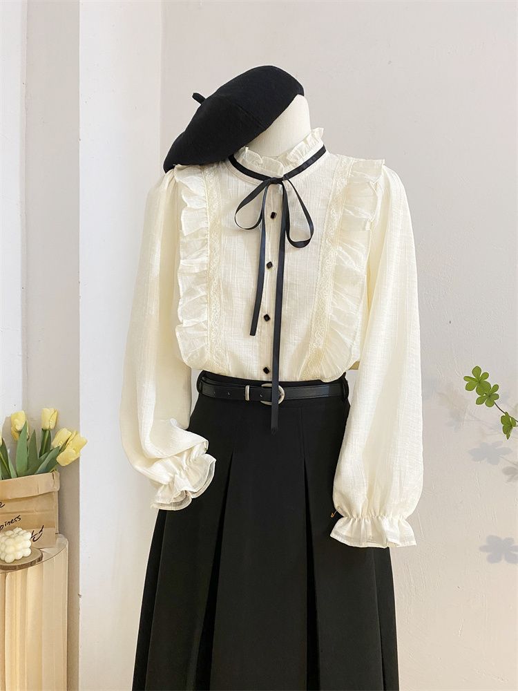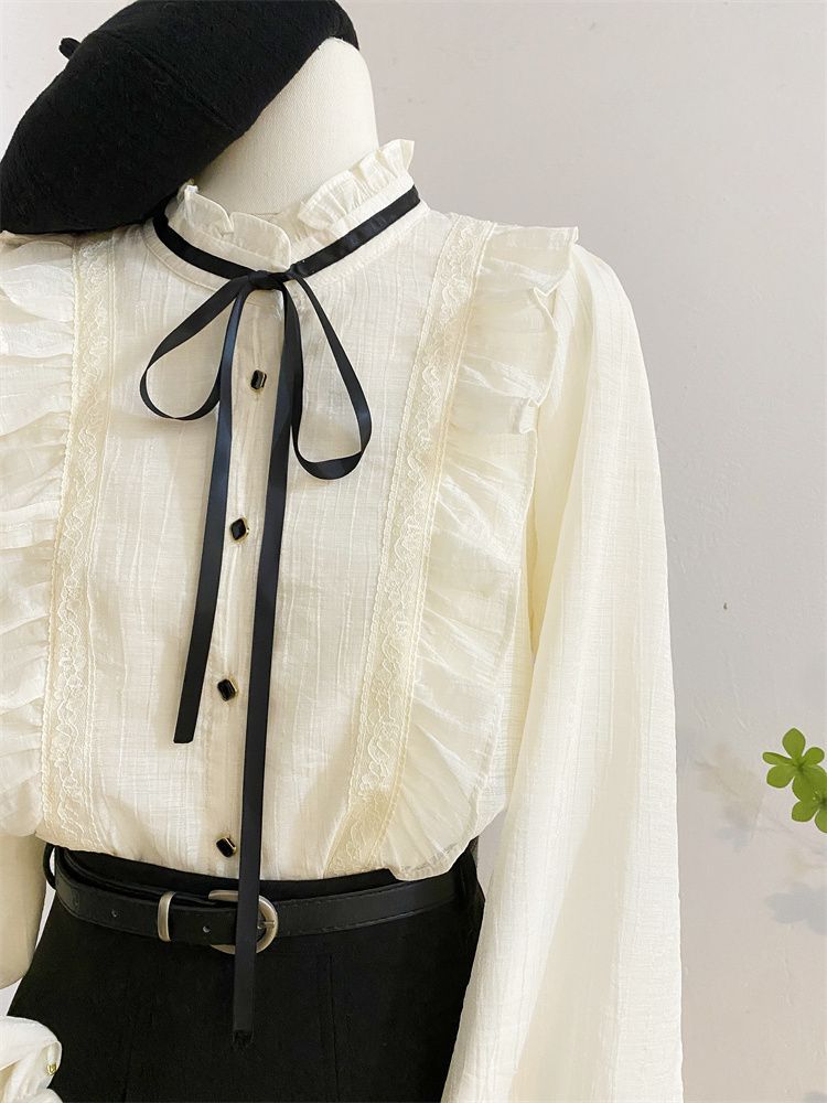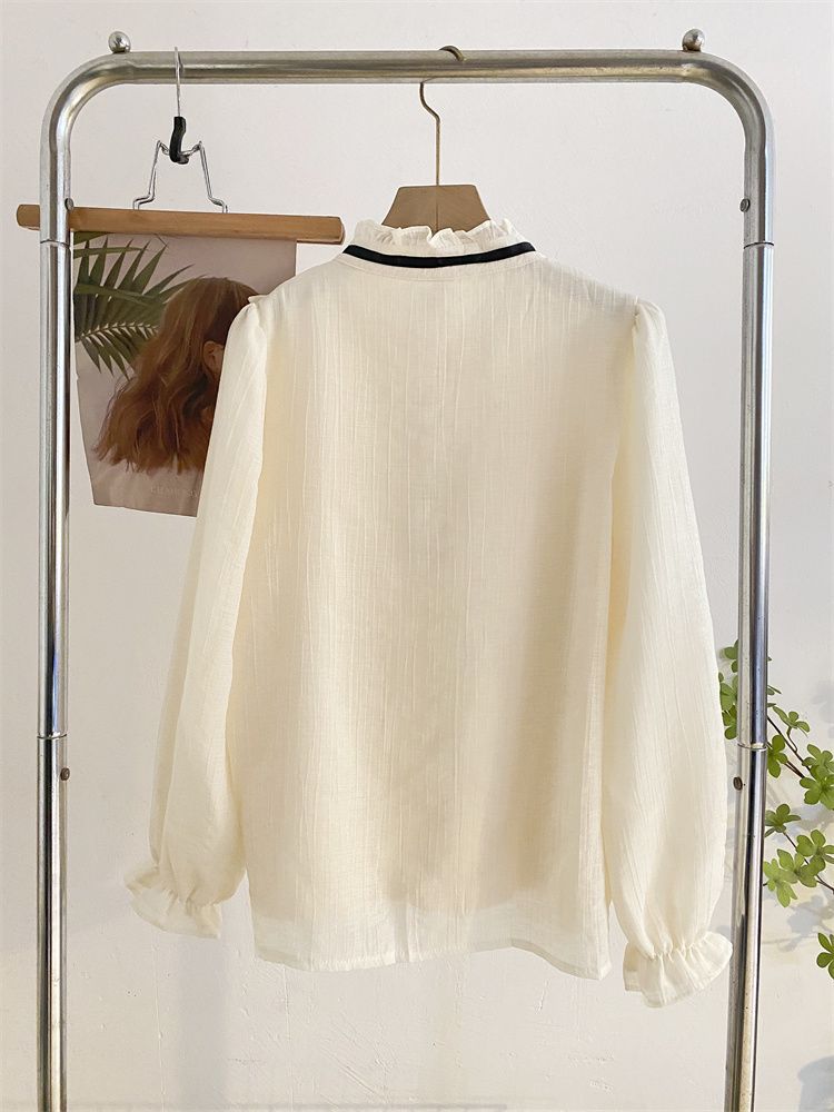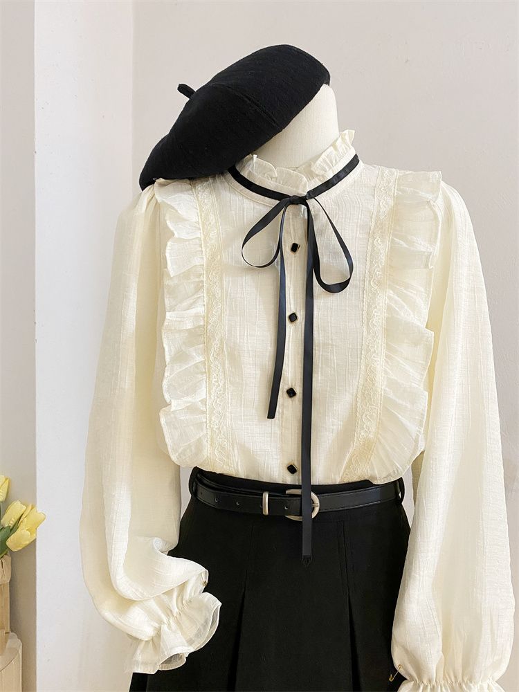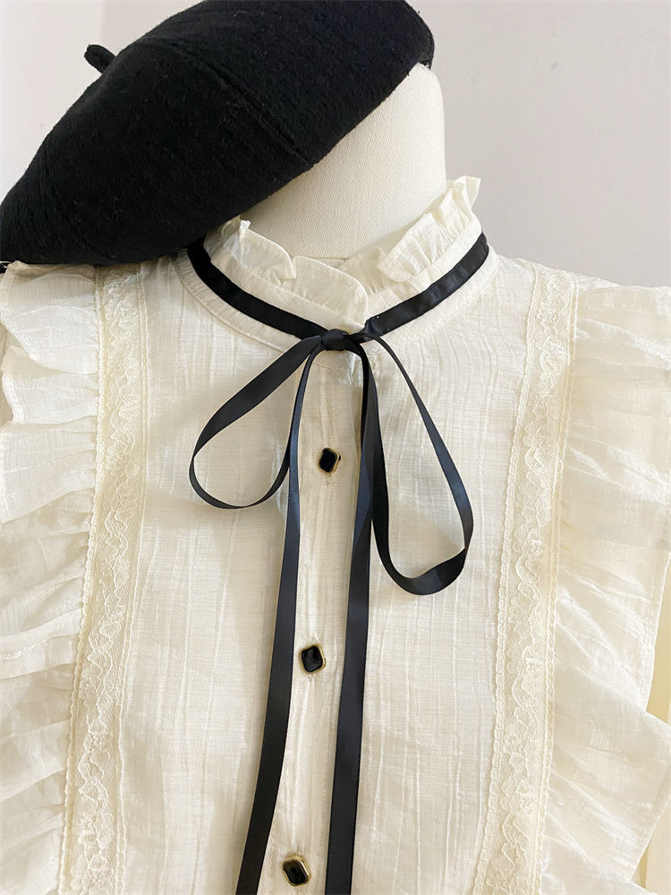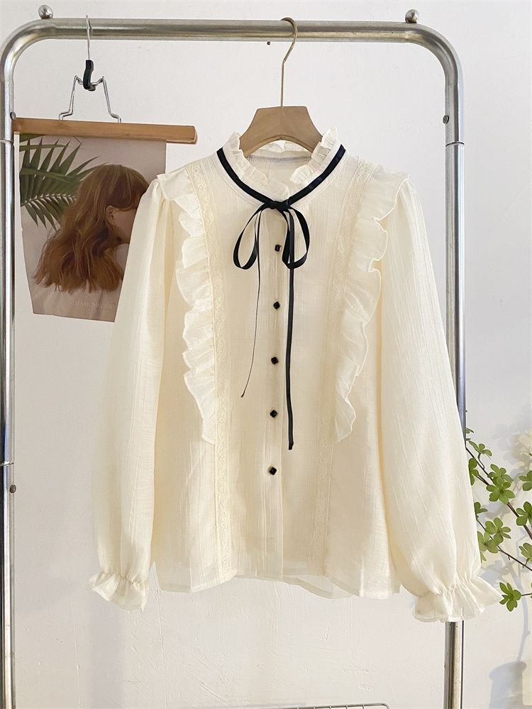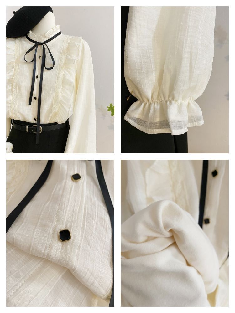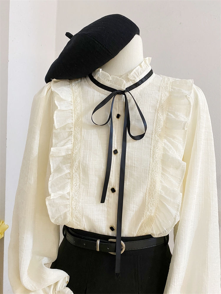 2025新款春秋季新款法式宫廷风木耳边雪纺上衣女别致衬衫优雅气质
