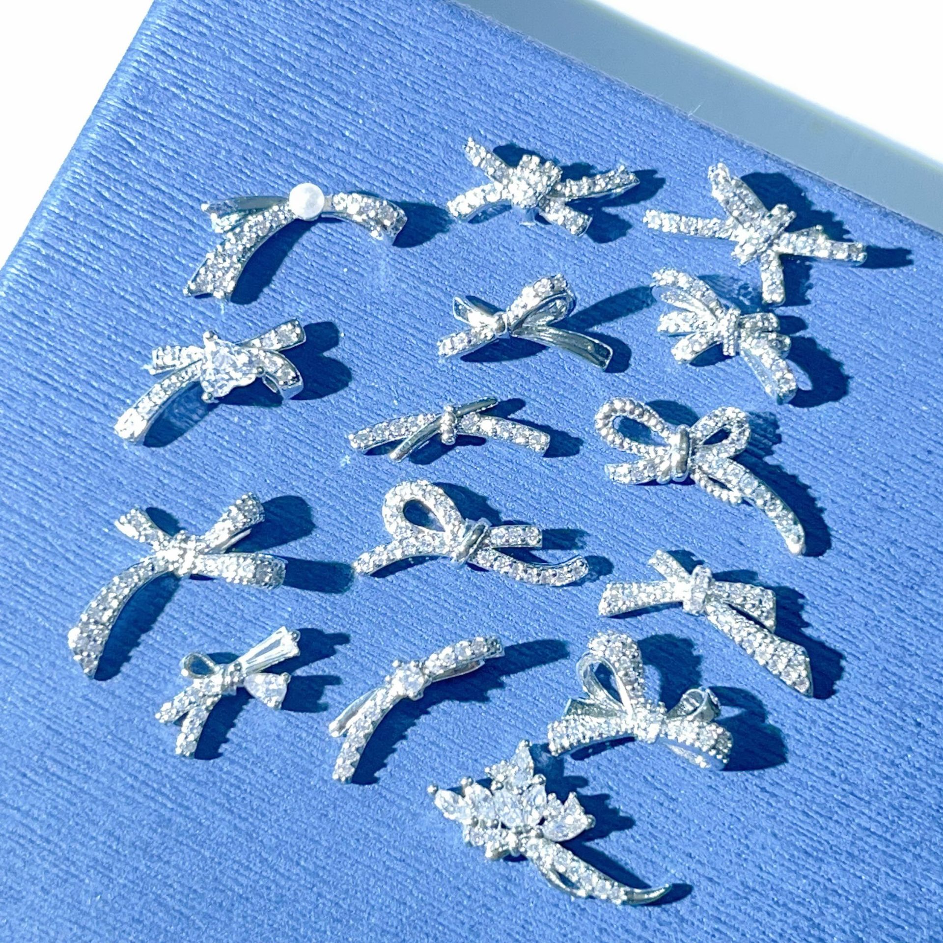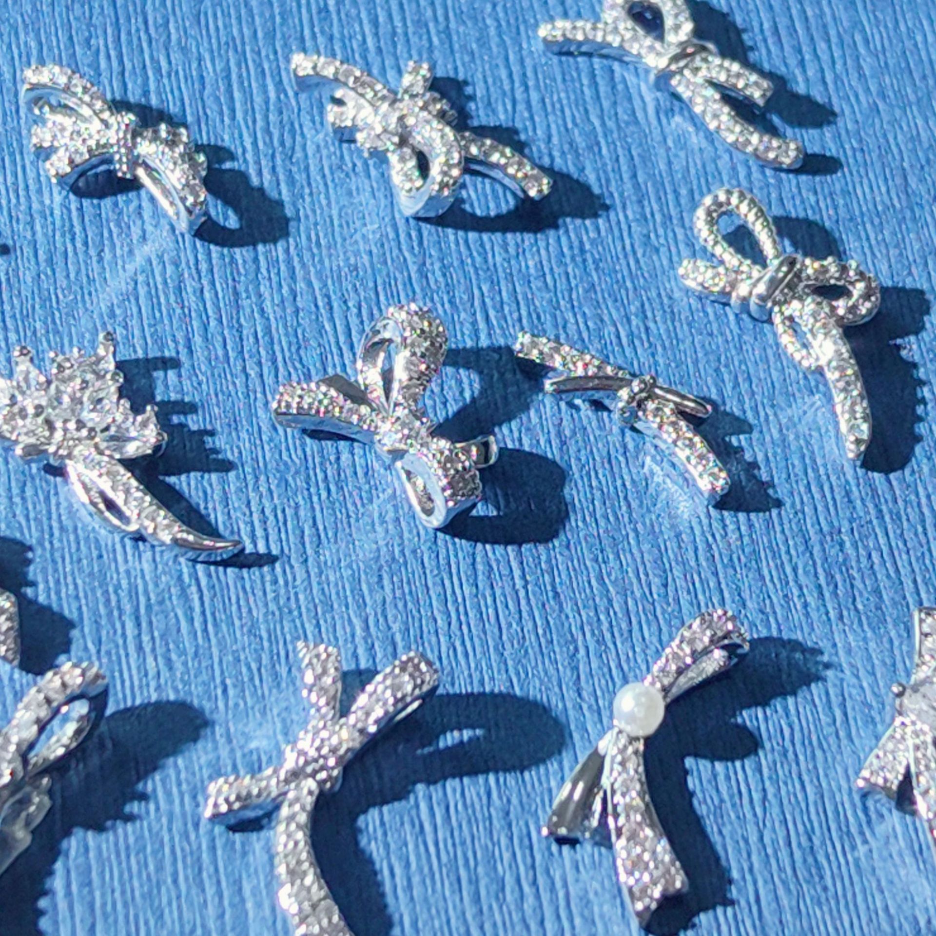 新款美甲饰品锆石侧边蝴蝶结银色立体飘带领结穿戴甲配饰金属钻饰