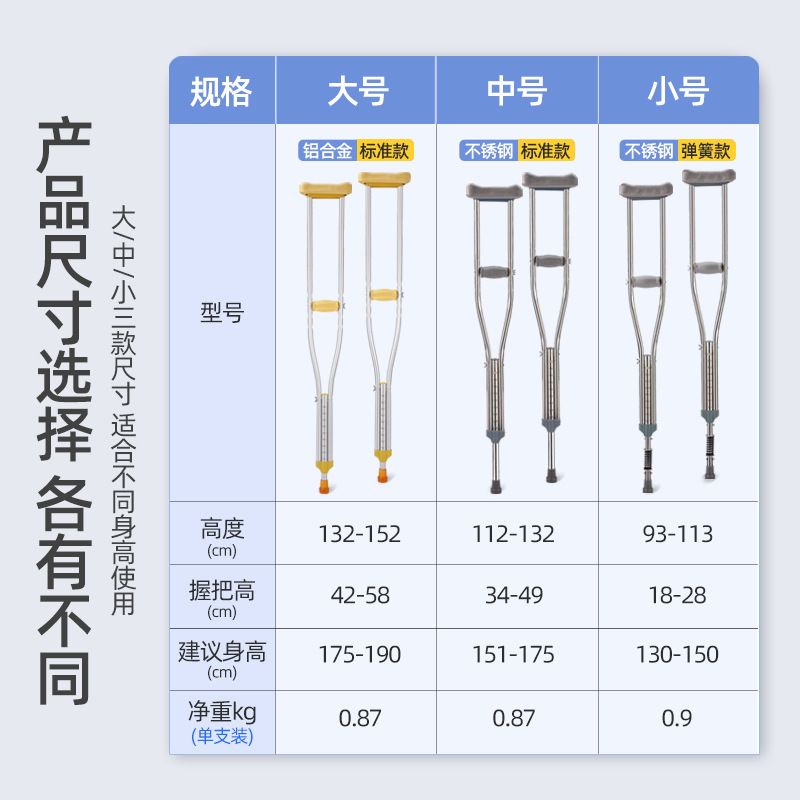 颜色 不锈钢标准款小号,铝合金标准款小号,铝合金标准款中号,铝合金标准款大号,不锈钢标准款中号,不锈钢标准款大号,加厚防滑)不锈钢儿童一支(身高125-135厘米),不锈钢弹簧款小号,不锈钢弹簧款中号,不锈钢弹簧款大号