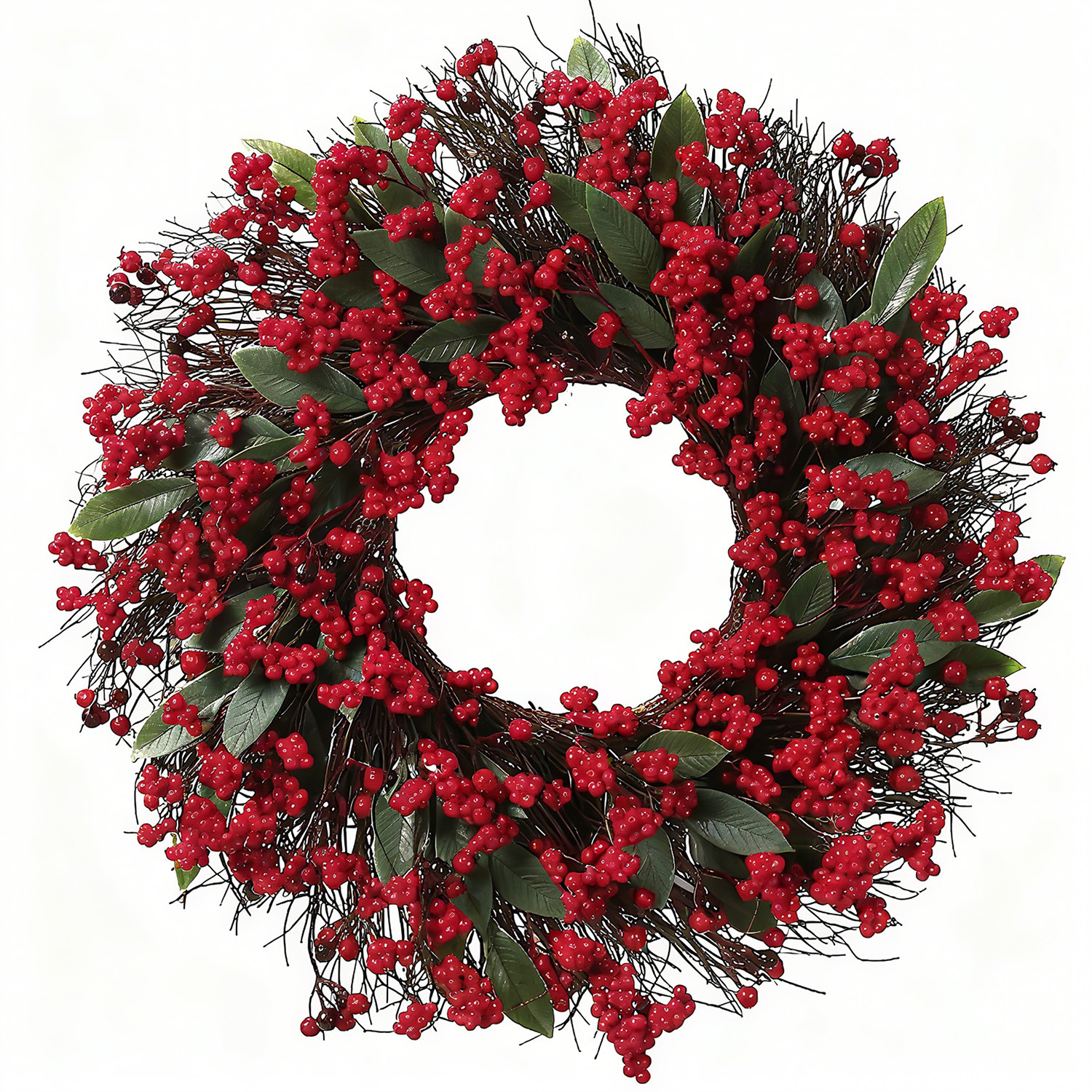 渝溪跨境新款圣诞节人造冬青圣诞仿真绿叶红果花环家居门挂装饰
