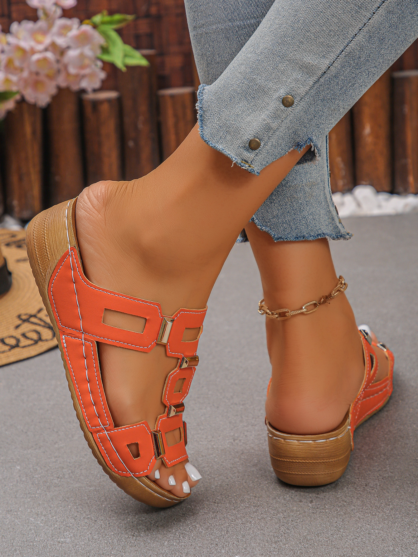跨境新款大码女鞋休闲一脚蹬车缝线金属扣凉拖鞋坡跟厚底镂空拖鞋