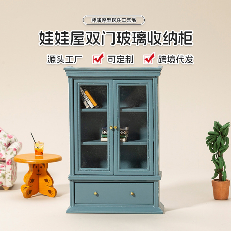 1:12娃娃屋配件摆件ob11书房客厅双门玻璃收纳柜子拍摄道具模型