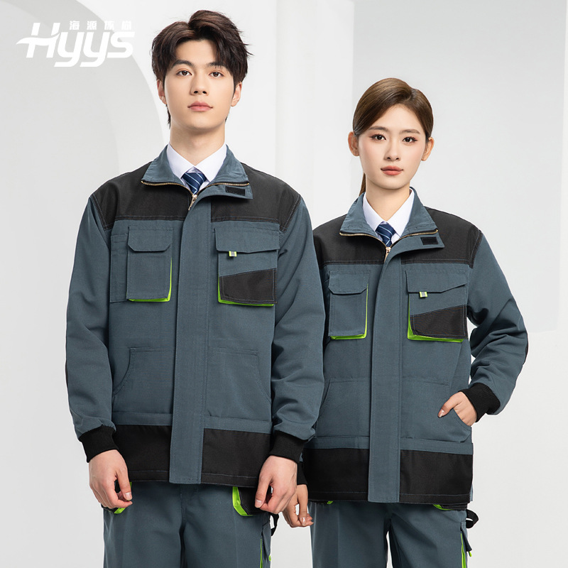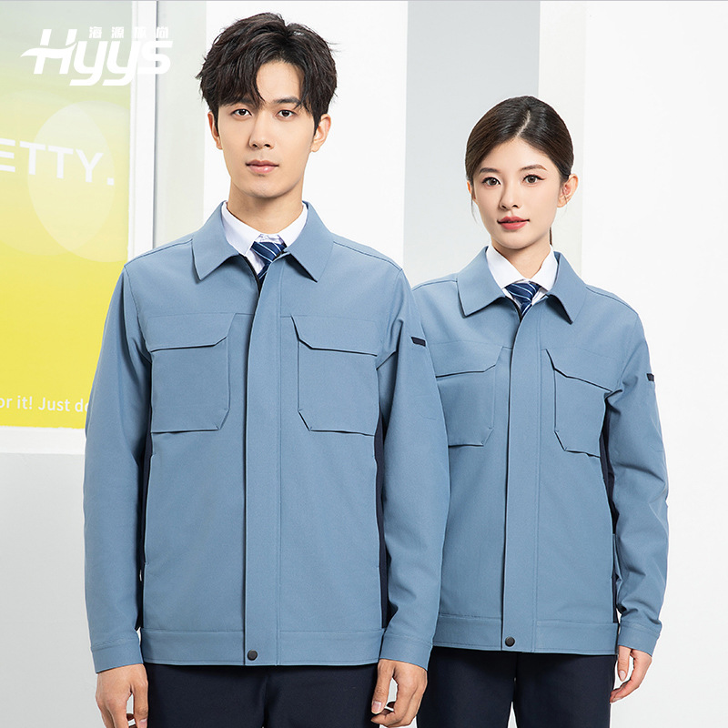 海源春秋長袖作業服セット メンズ ロゴ入り カラーブロック 耐摩耗性 機械修理 現場作業服 工場服 上着 卸売
