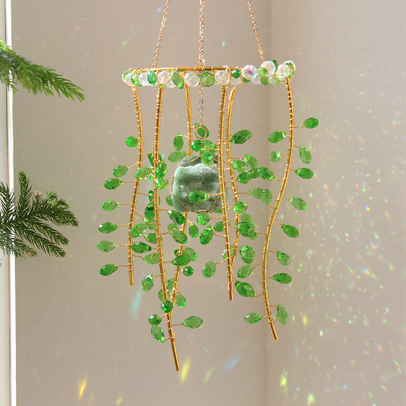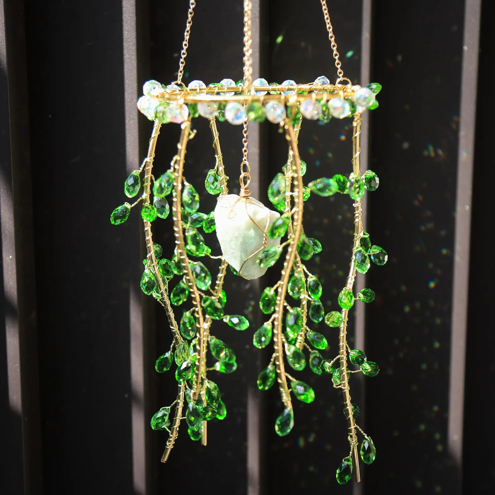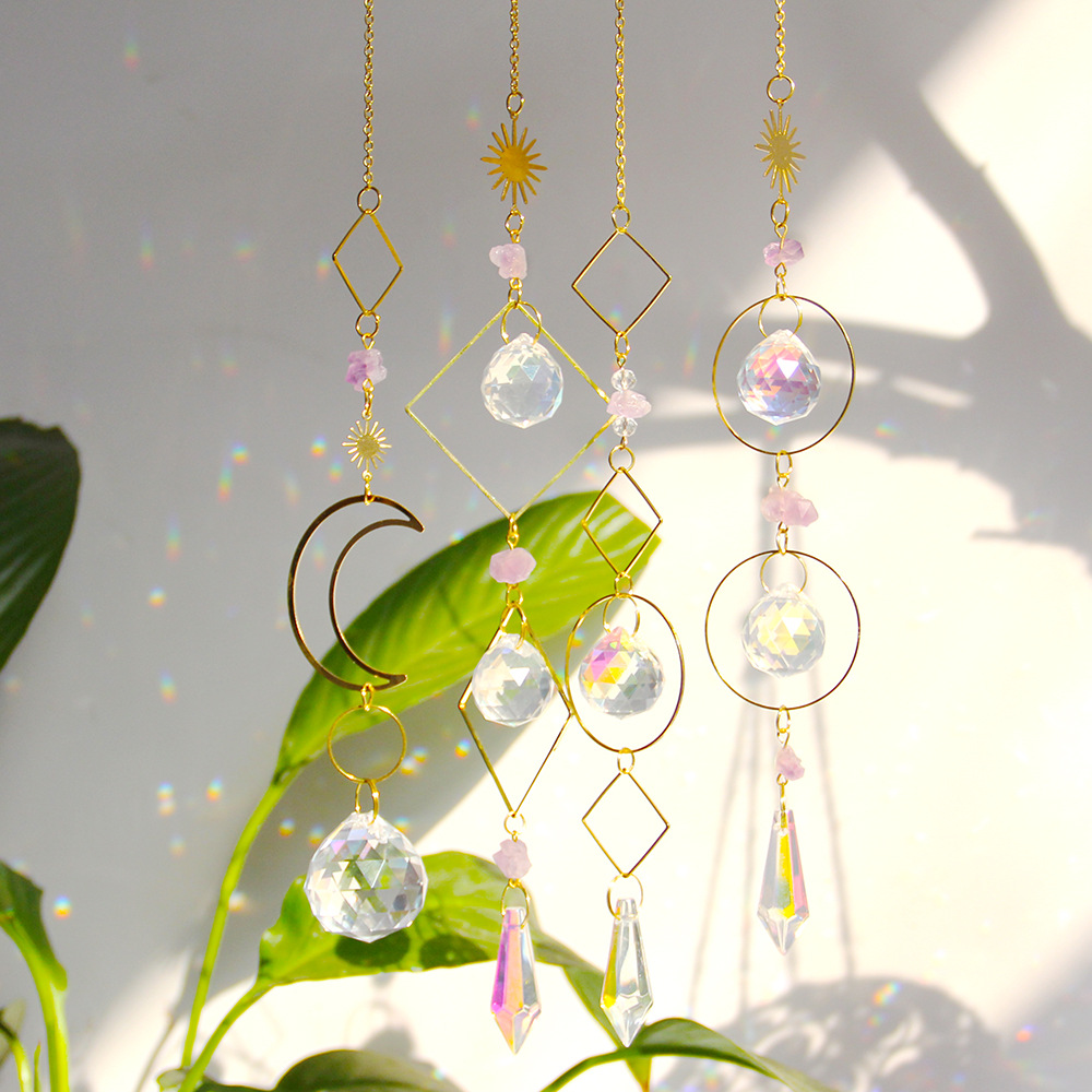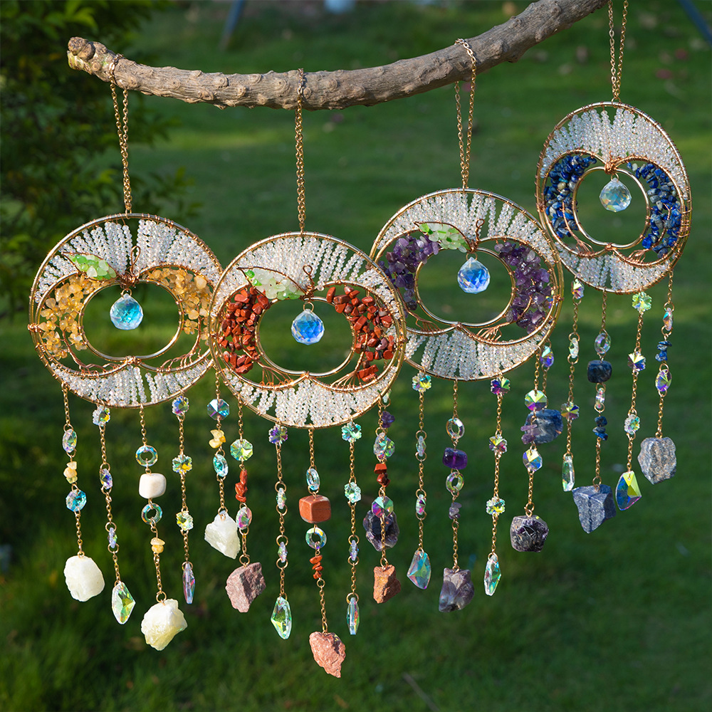 跨境批发天然碎石水晶月亮手工缠绕diy太阳捕手光影风铃水晶挂件