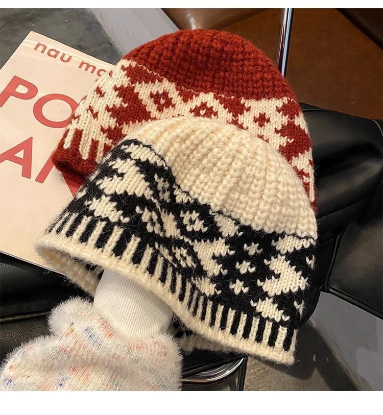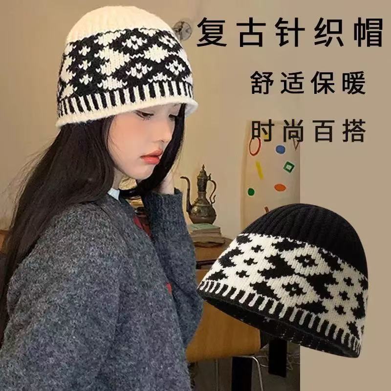 新款复古帽毛线帽百搭针织韩版秋冬显脸小时尚保暖加厚提花堆堆帽