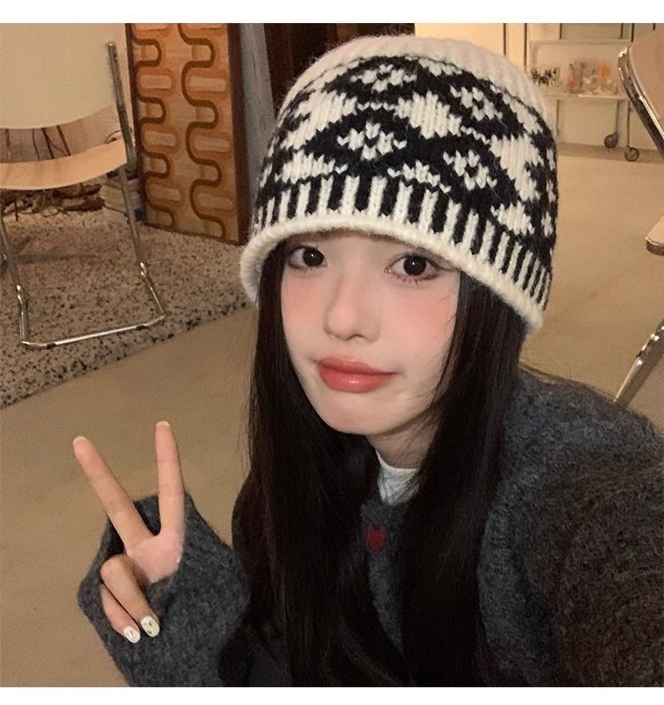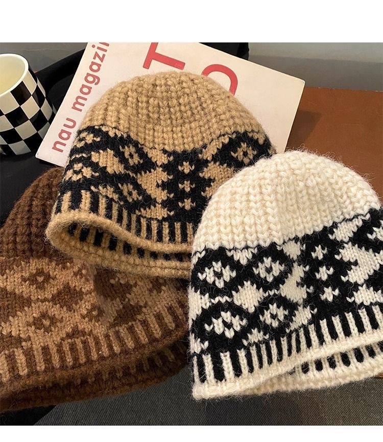 24ss秋冬新作ハト柄ジャカードニット帽子韓国保温レトロ毛糸バケツ帽子カップルファッション