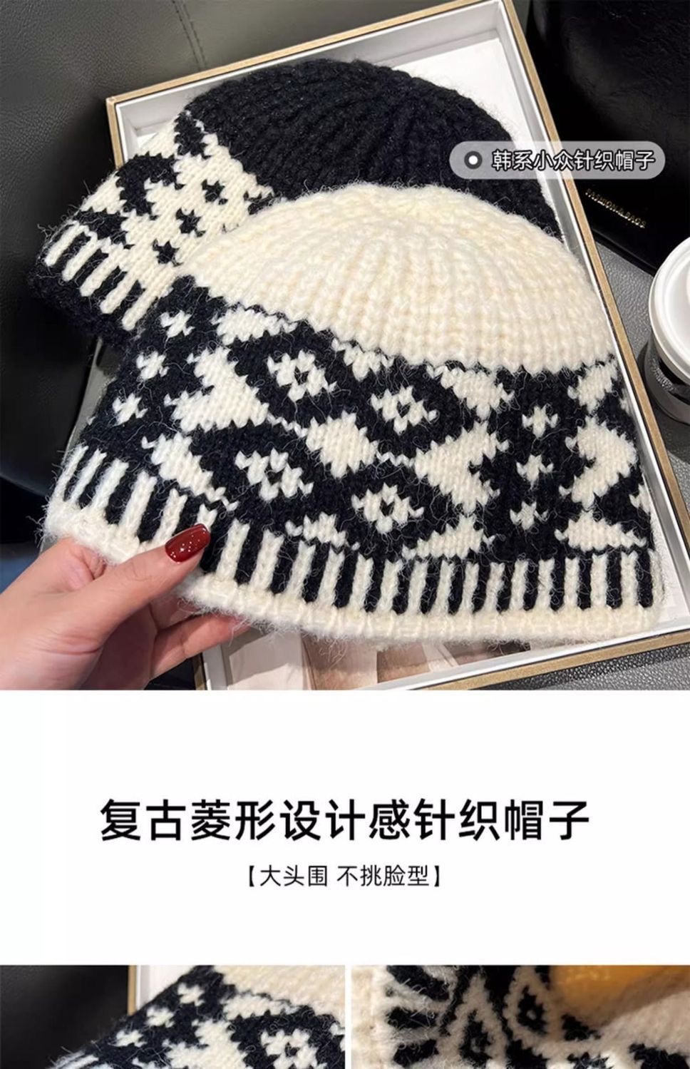 2025复古菱形格子渔夫帽女秋冬季显脸小百搭拼色大头围针织毛线帽