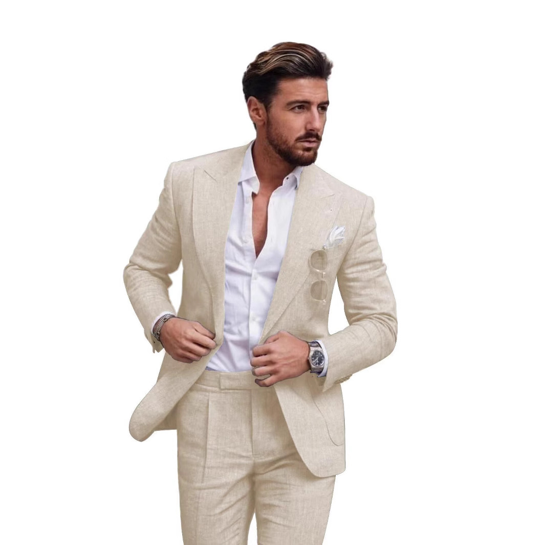 クロスボーダーホスティングリネンスーツ2点セット1ボタンラペルカラーカジュアル貿易新郎結婚式スーツスーツ男性用