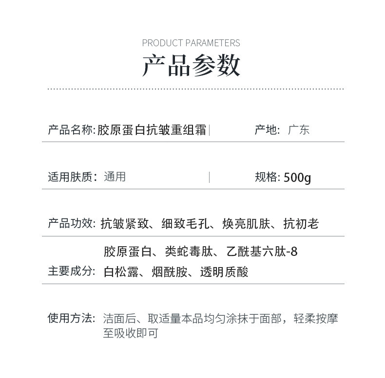 产品规格 胶原蛋白抗皱重组霜500g/瓶,山羊奶水光爆奶霜500g/瓶,玻色因黑绷带抗皱面霜60g/瓶,角鲨烷抗皱眼霜30g/瓶,熊果苷维C晚霜50g