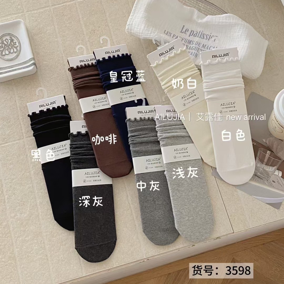 2025秋冬季女士直板堆堆袜纯棉无骨女中筒袜子纯色木耳边百搭平板