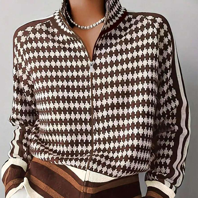 秋冬の日韓の新型の大きいサイズのゆったりした雰囲気の花柄の格子の立襟のニットはやせているセーターのコートの女性を現します。