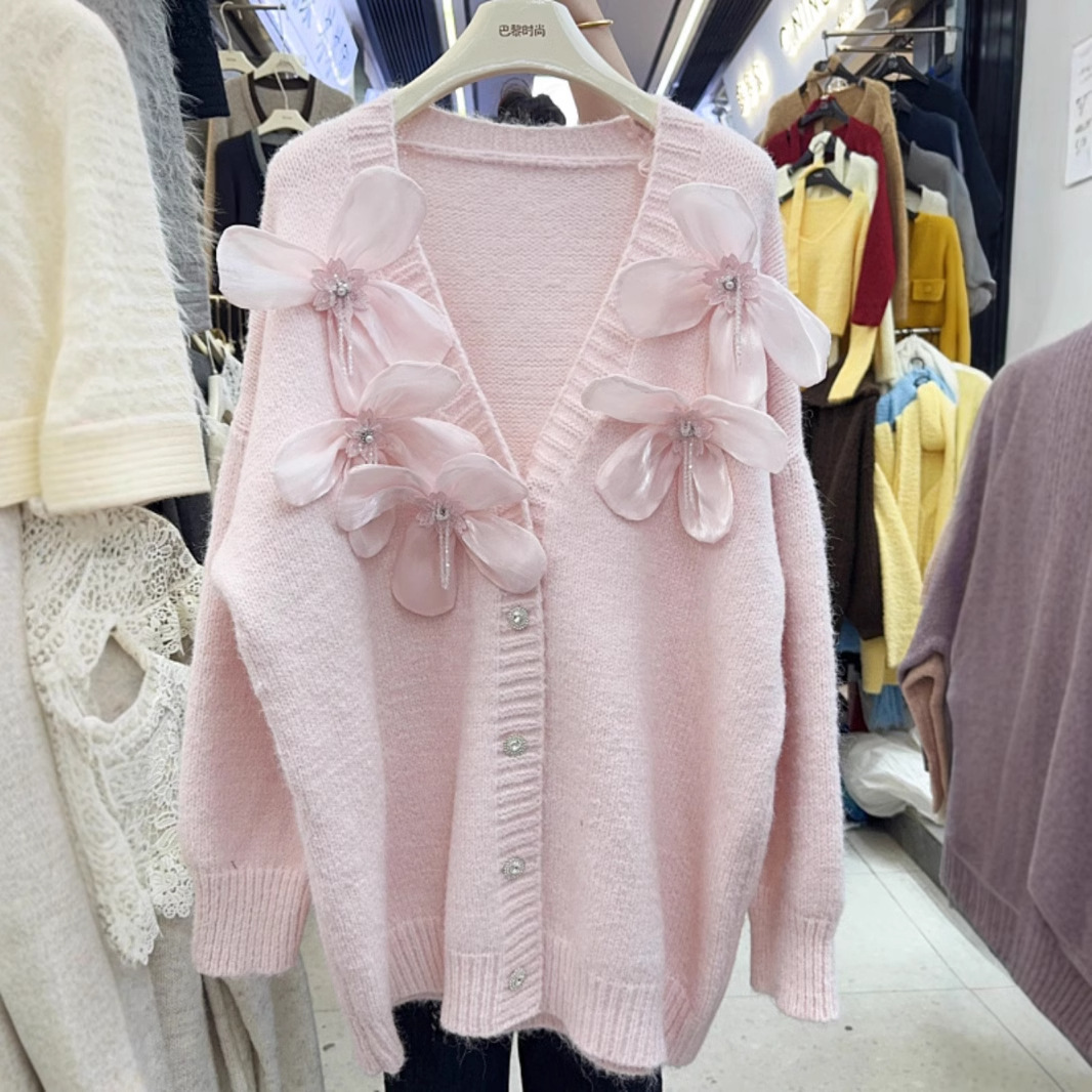 原版欧洲站2024秋冬立体花朵甜美设计感针织衫气质宽松毛衣外套