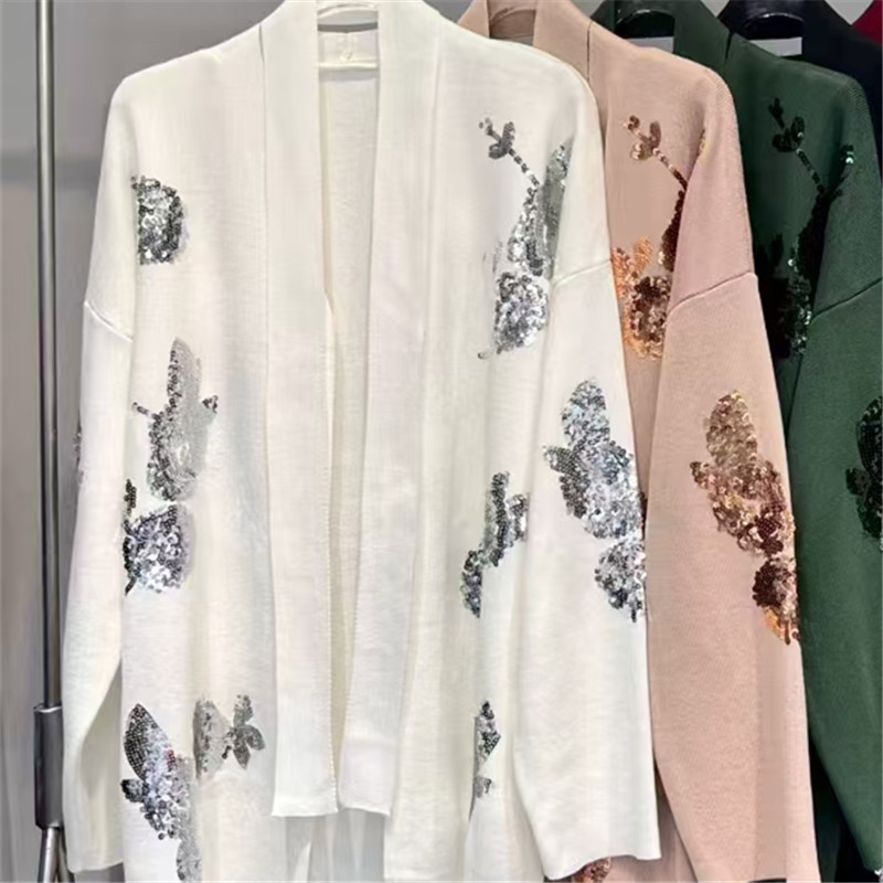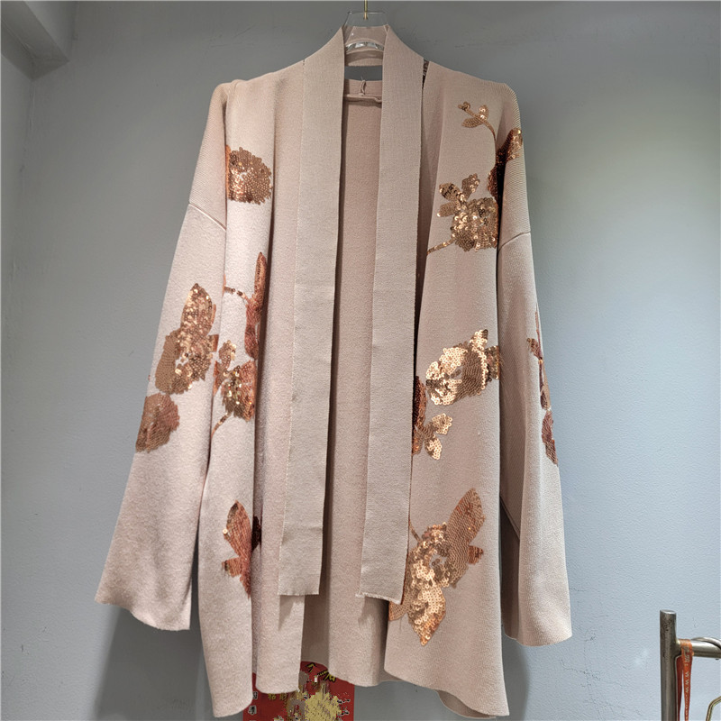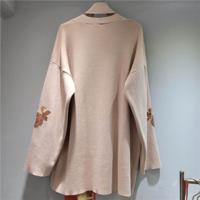 欧美跨境重工亮片刺绣V领针织开衫秋冬新款慵懒宽松显瘦毛衣外套