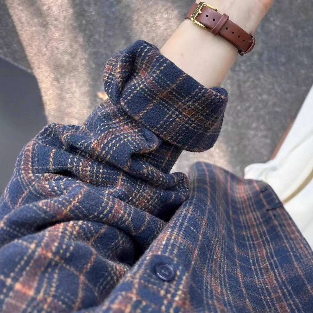 綿の格子のシャツ2025の新型の女性の復古の高級感のシャツの中で上着の秋冬の薄いコートを重ねて着ます。