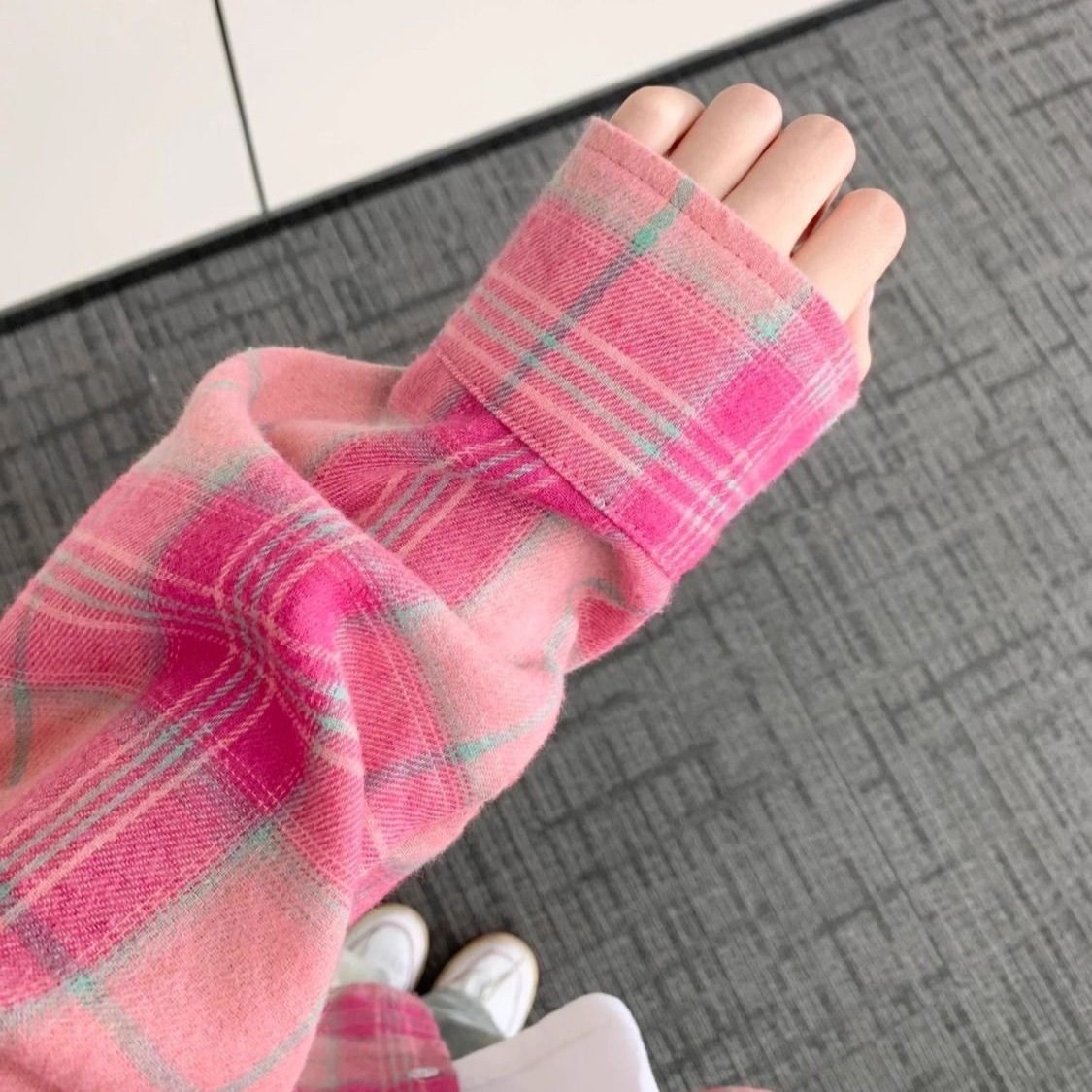 粉色格子衬衫磨毛高级感穿搭叠穿新款冬内搭衬衣长袖上衣春秋外套