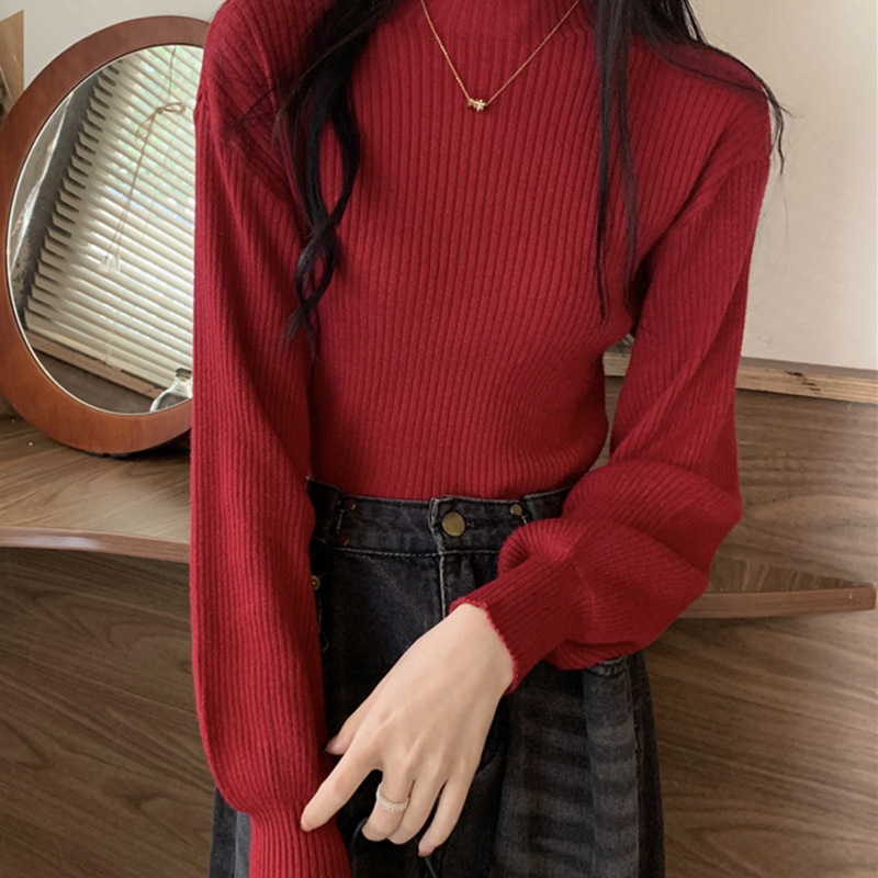 半高襟ニットセーター女性2023秋冬新韓国版修身が痩せているシャツに合わせてファッション上着を着ている女性