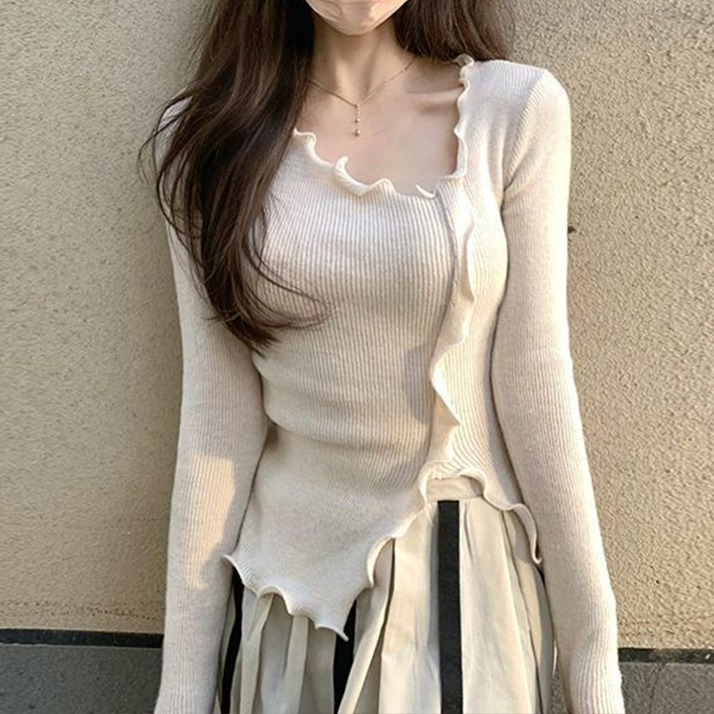純粋な欲望の木の耳元のニットの底のシャツの春秋の小さい大衆の不規則な修身の上着のデザイン感が見えて痩せています。