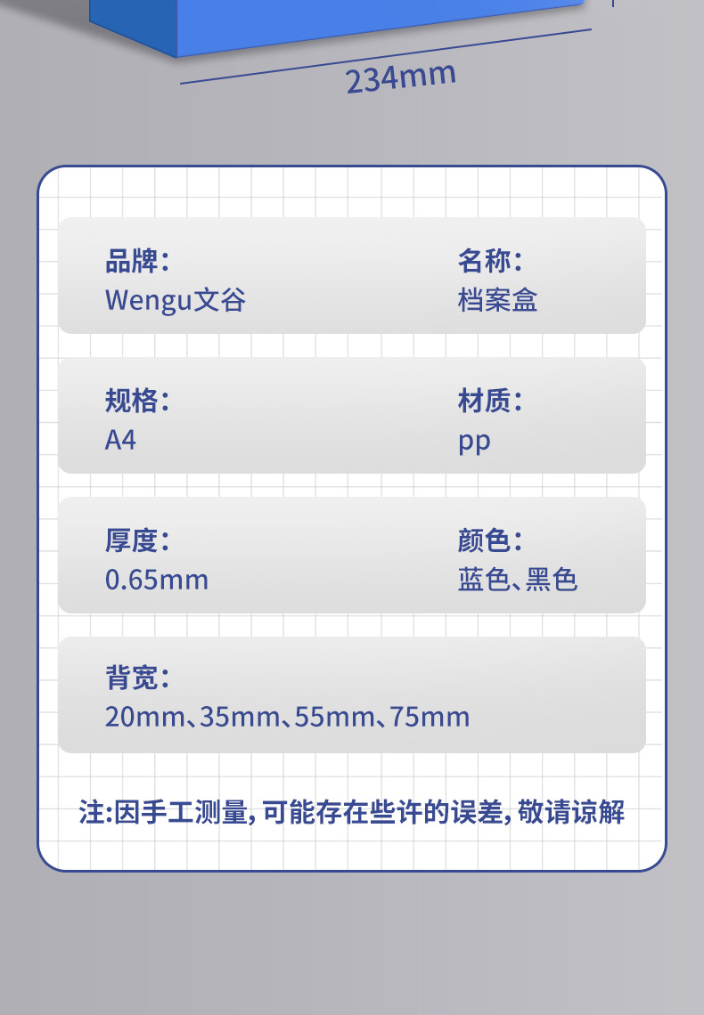 规格 A4档案盒-75mm-玄夜黑,A4档案盒-75mm-普鲁士蓝,A4档案盒-55mm-玄夜黑,A4档案盒-55mm-普鲁士蓝,A4档案盒-35mm-玄夜黑,A4档案盒-35mm-普鲁士蓝,A4档案盒-20mm-玄夜黑,A4档案盒-20mm-普鲁士蓝