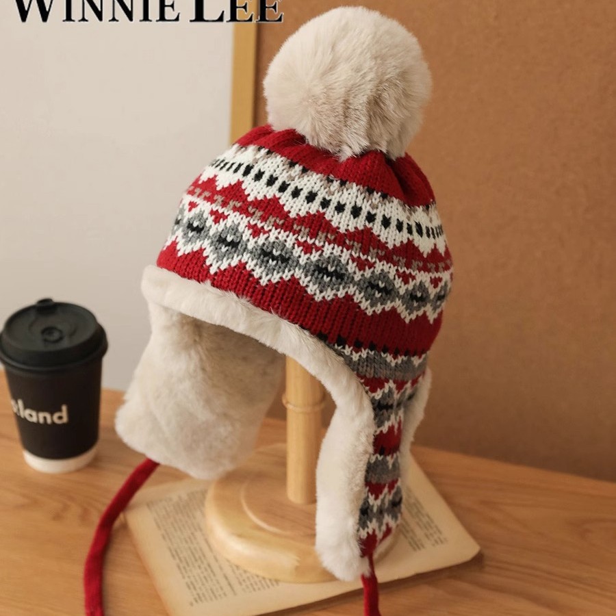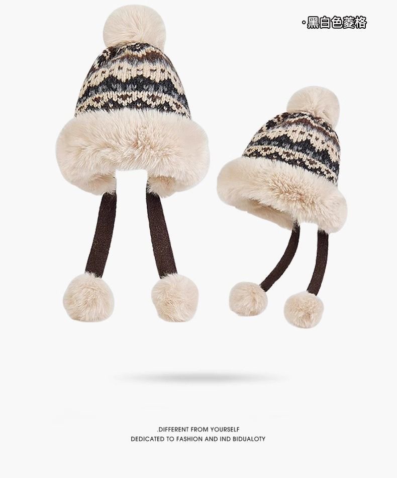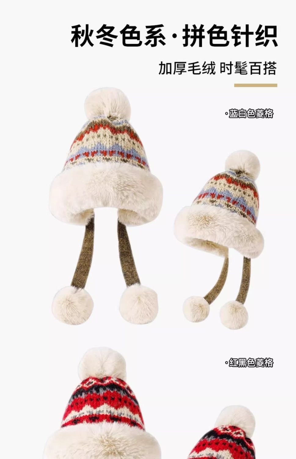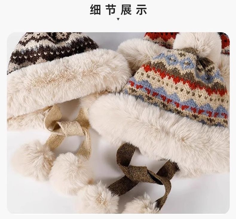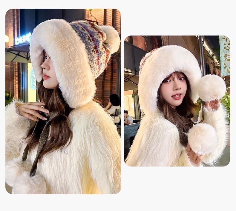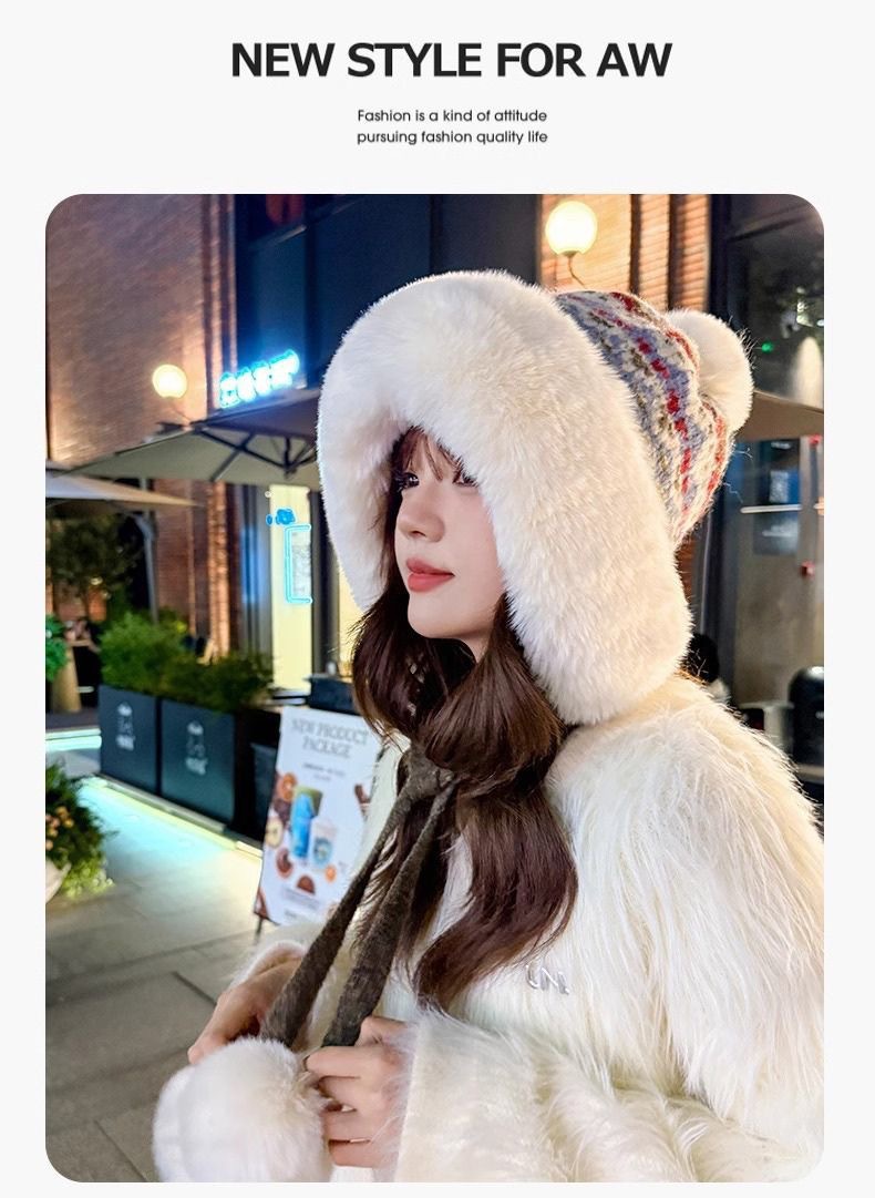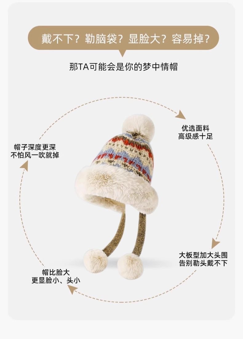 帽子女冬季可爱系带毛绒款兔耳朵大头围加厚保暖针织毛线雷锋帽