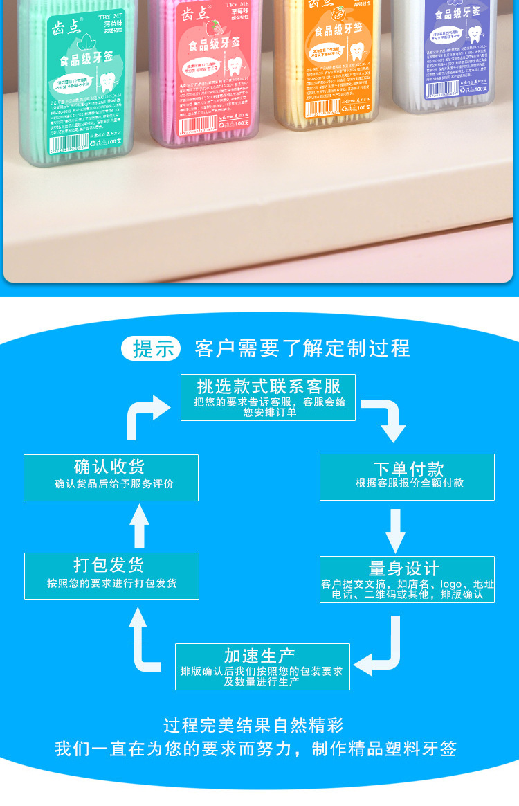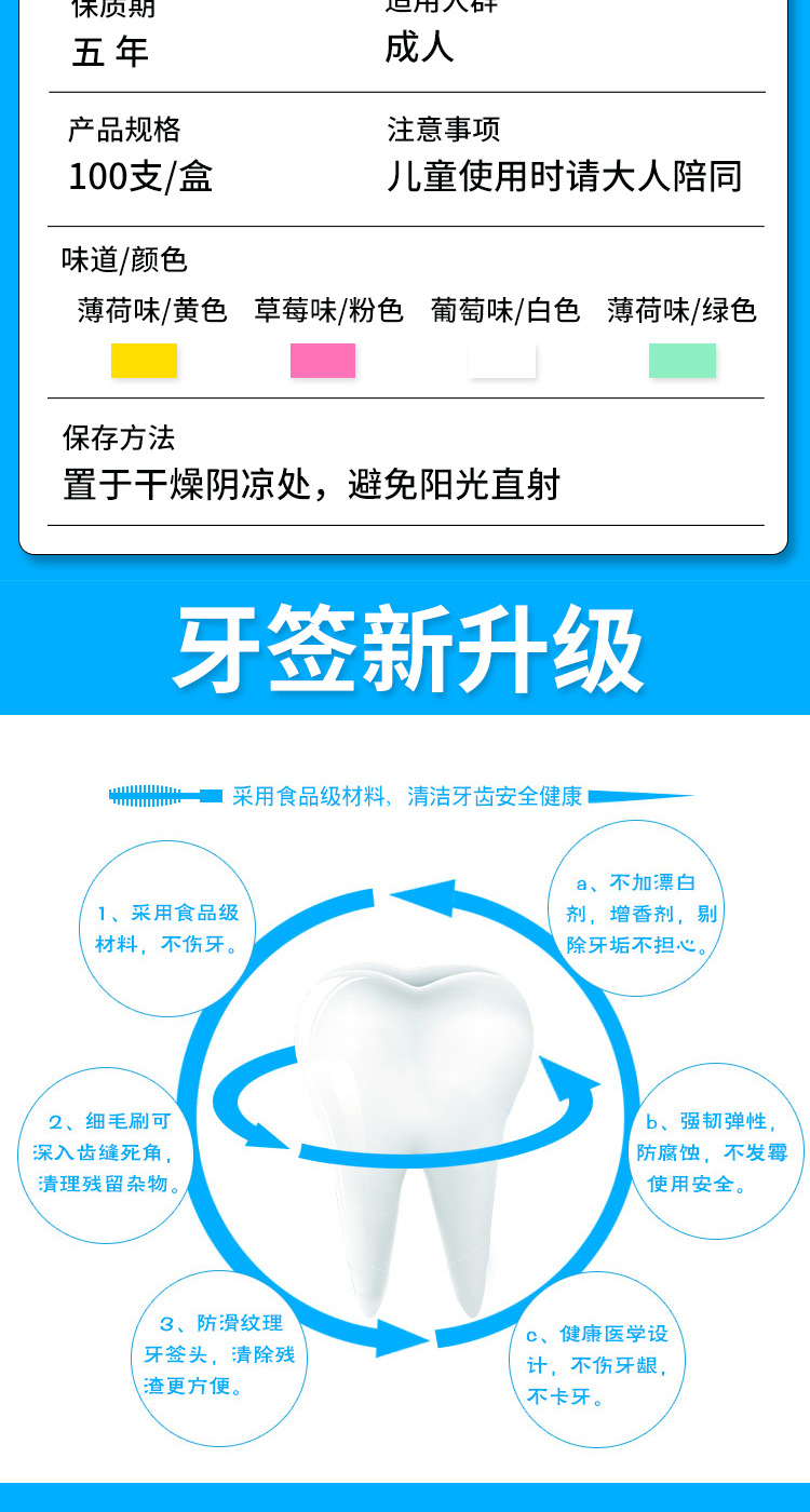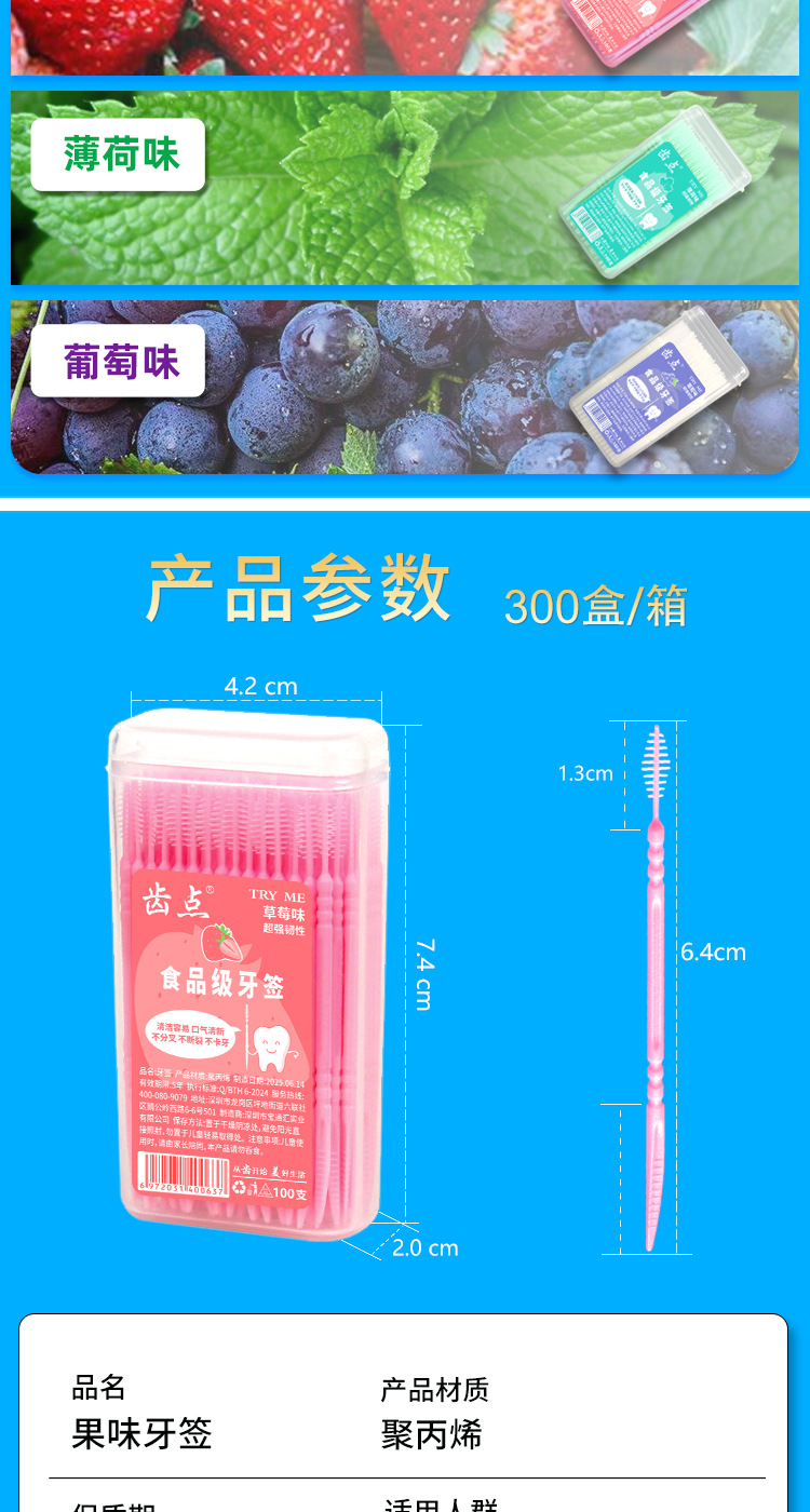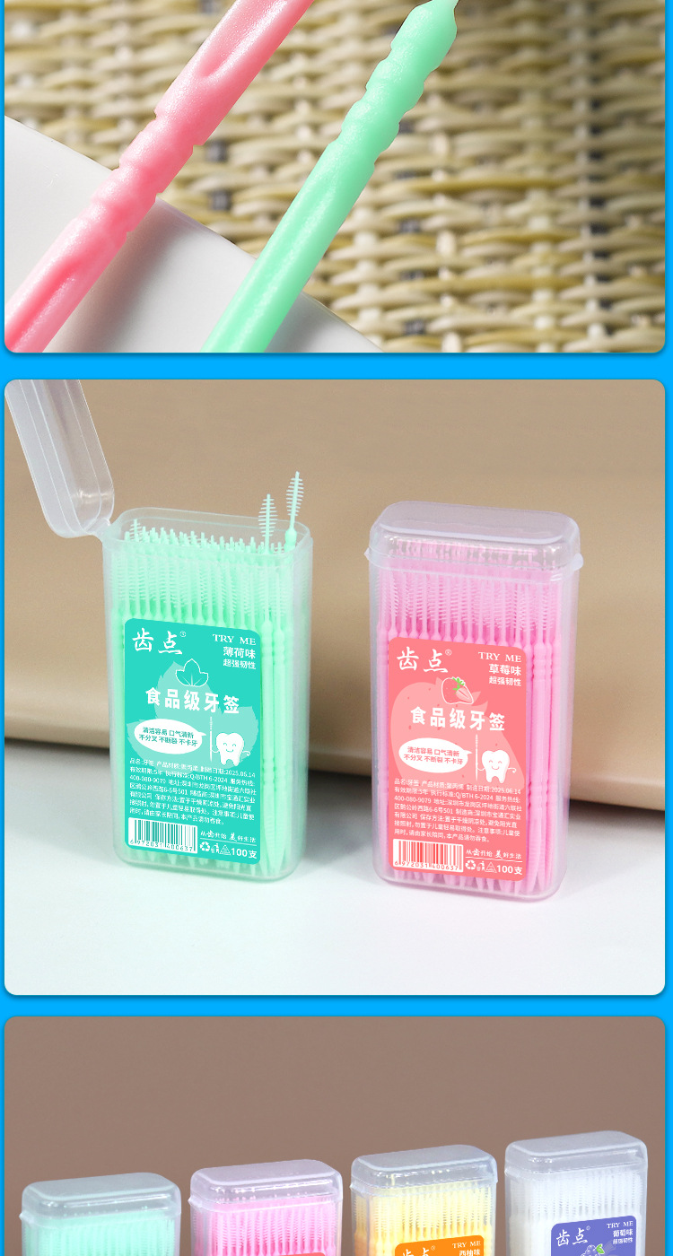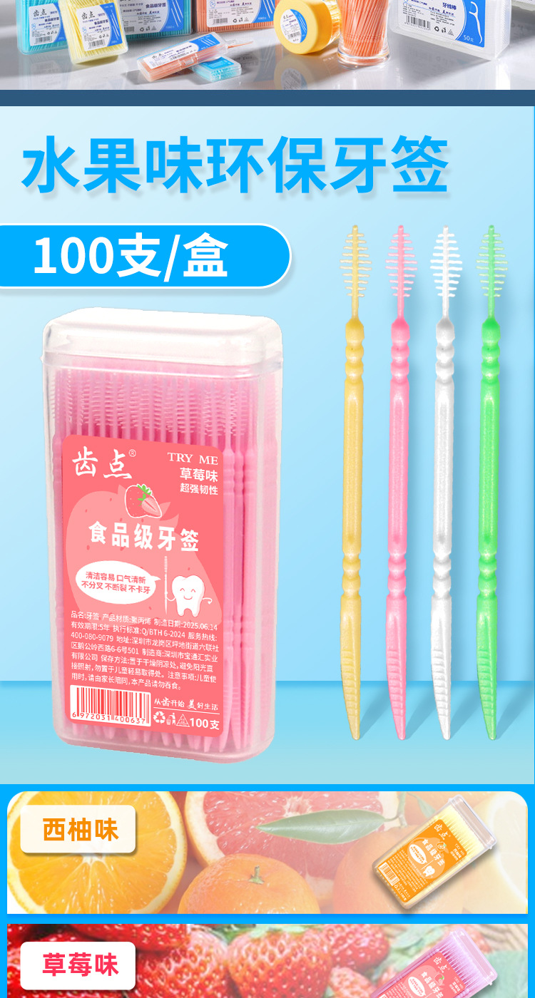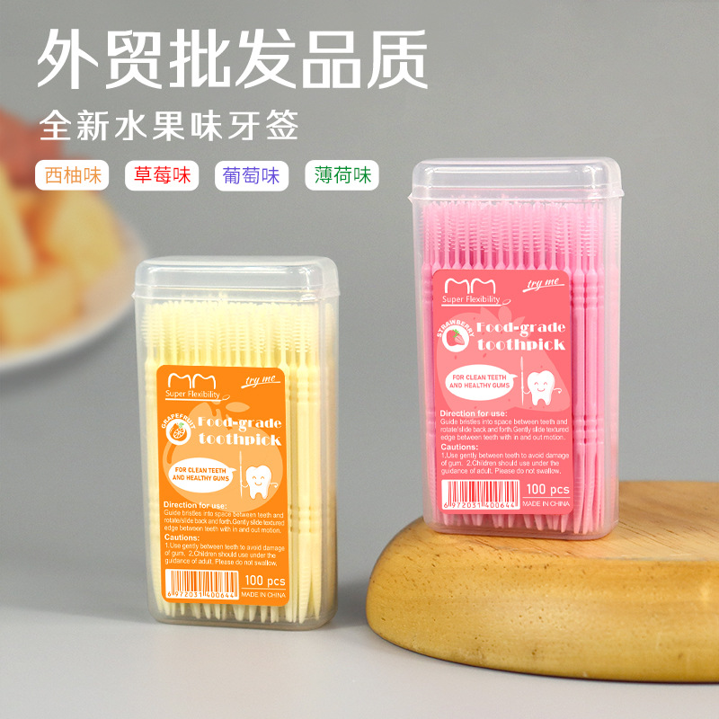 跨境批发定制水果味塑料牙签100支一盒一次性薄荷双头牙间刷剔牙