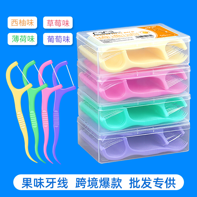 国境を越えた対外貿易の歯の糸のメーカーの卸売りの超細い歯の糸の果物の味の箱の50本の歯の線の棒の使い捨てのつまようじ
