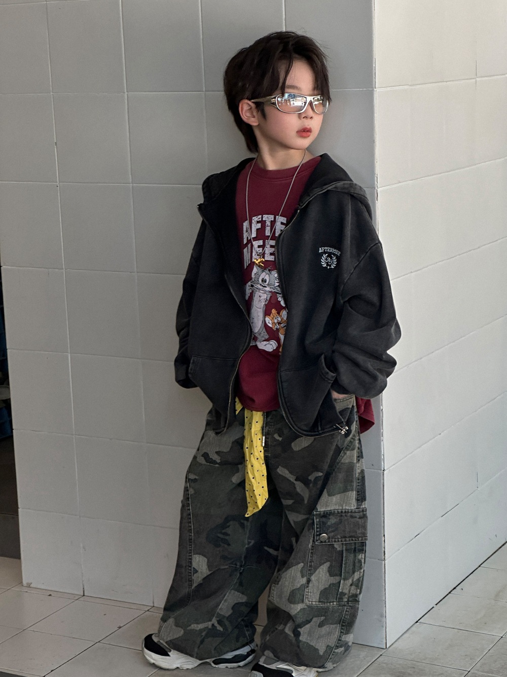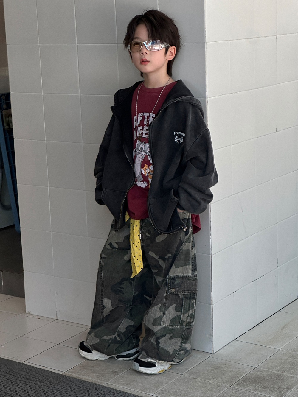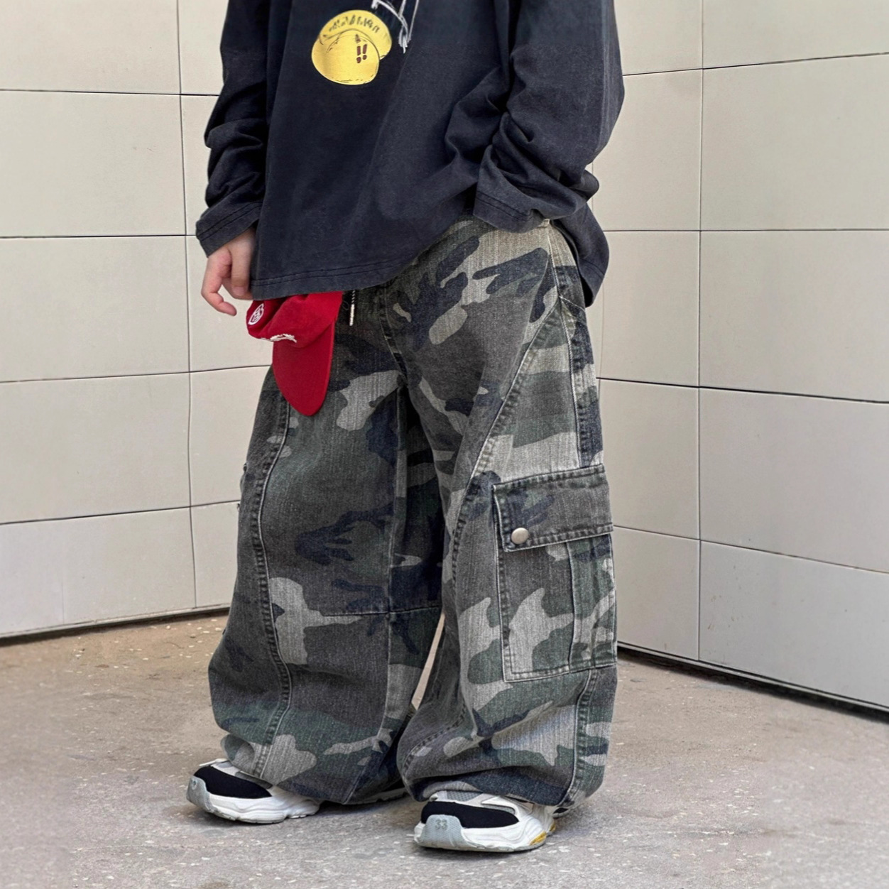 新尔2025秋季新款重工洗褪做旧迷彩弯刀裤儿童纯棉工装裤男童裤子