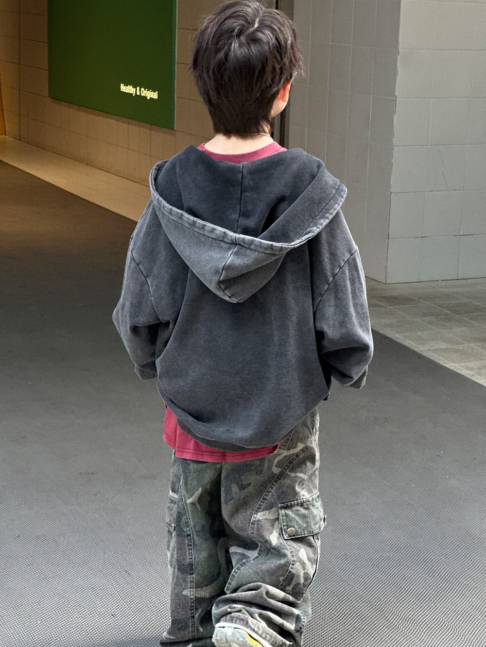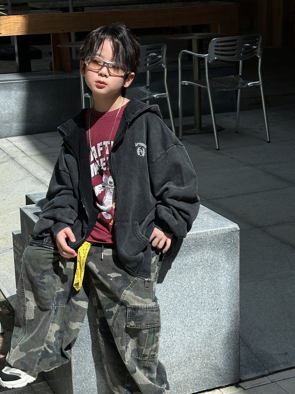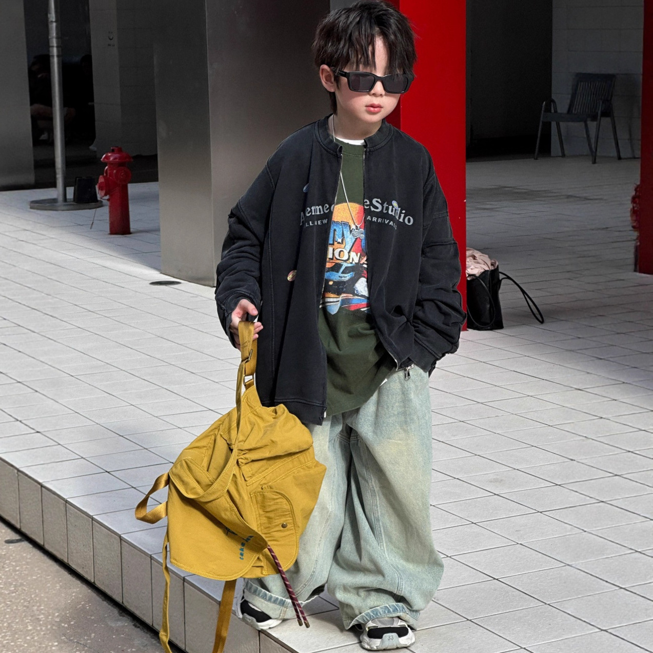 新尔2025秋季新款小立领做旧炒洗开衫外套纯棉毛圈儿童宽松上衣潮