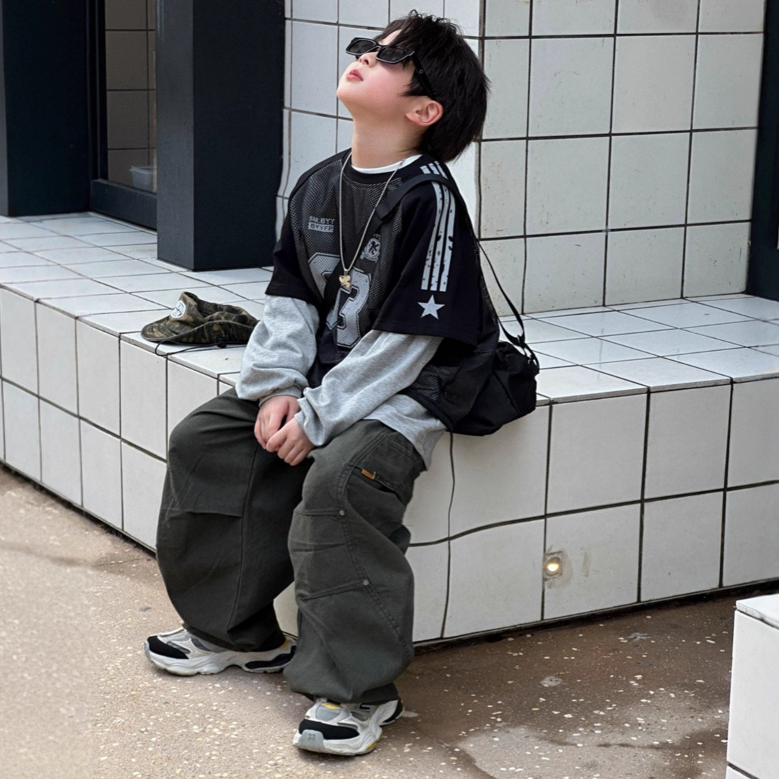 新尔2025秋季新款拼接袖套网眼假两件长袖T恤儿童个性上衣男童潮