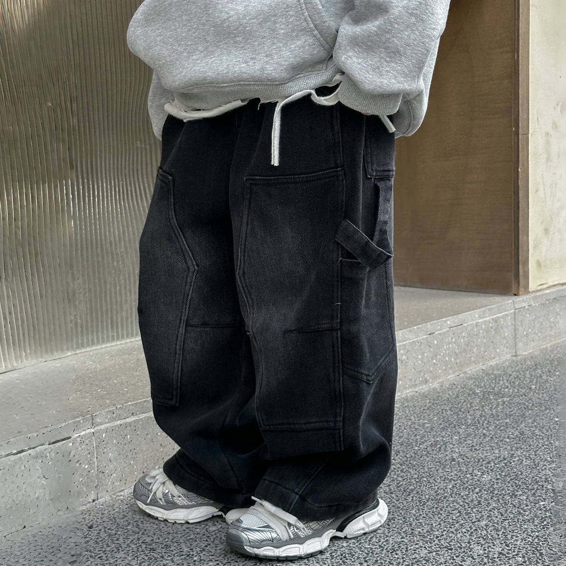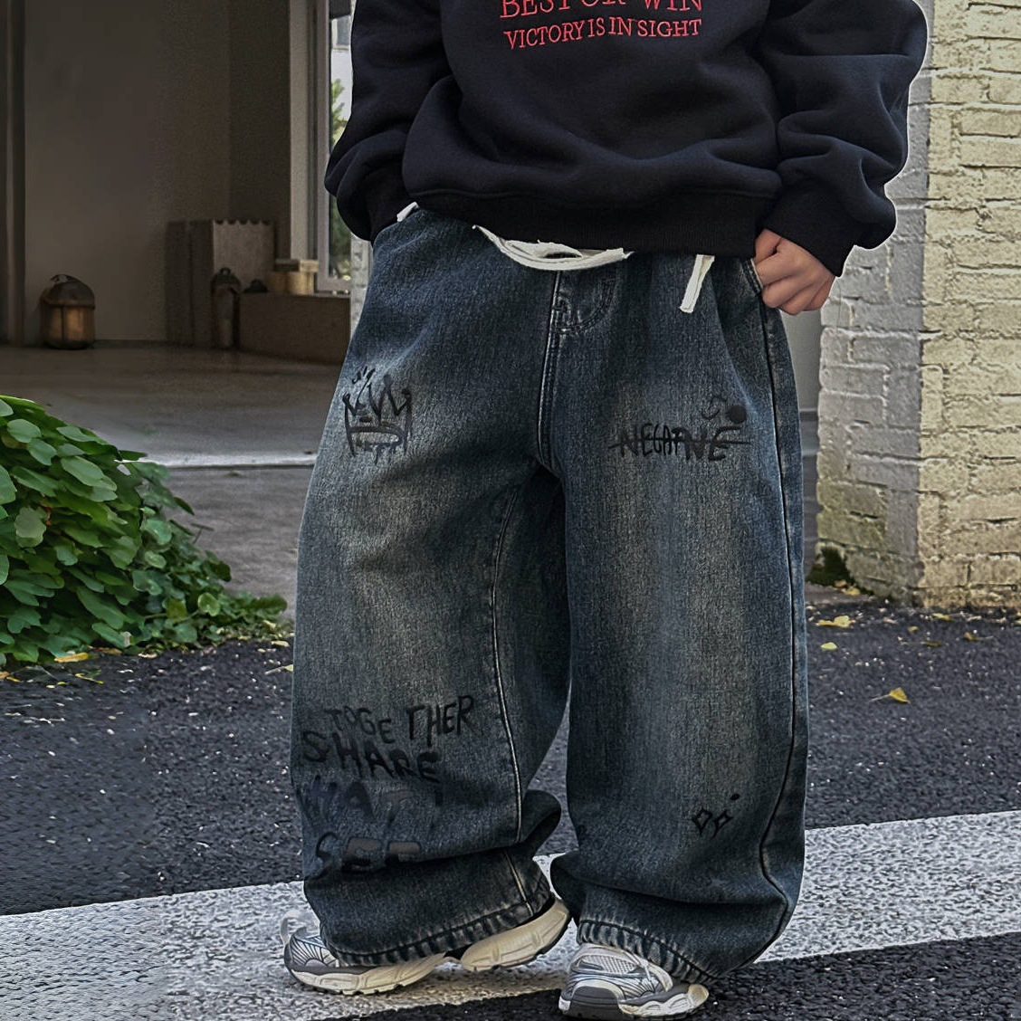 新爾2024冬の新型落書きプリントとジーンズのゆるいストレート一体型のベルベットのズボンの男の子が一緒にいる