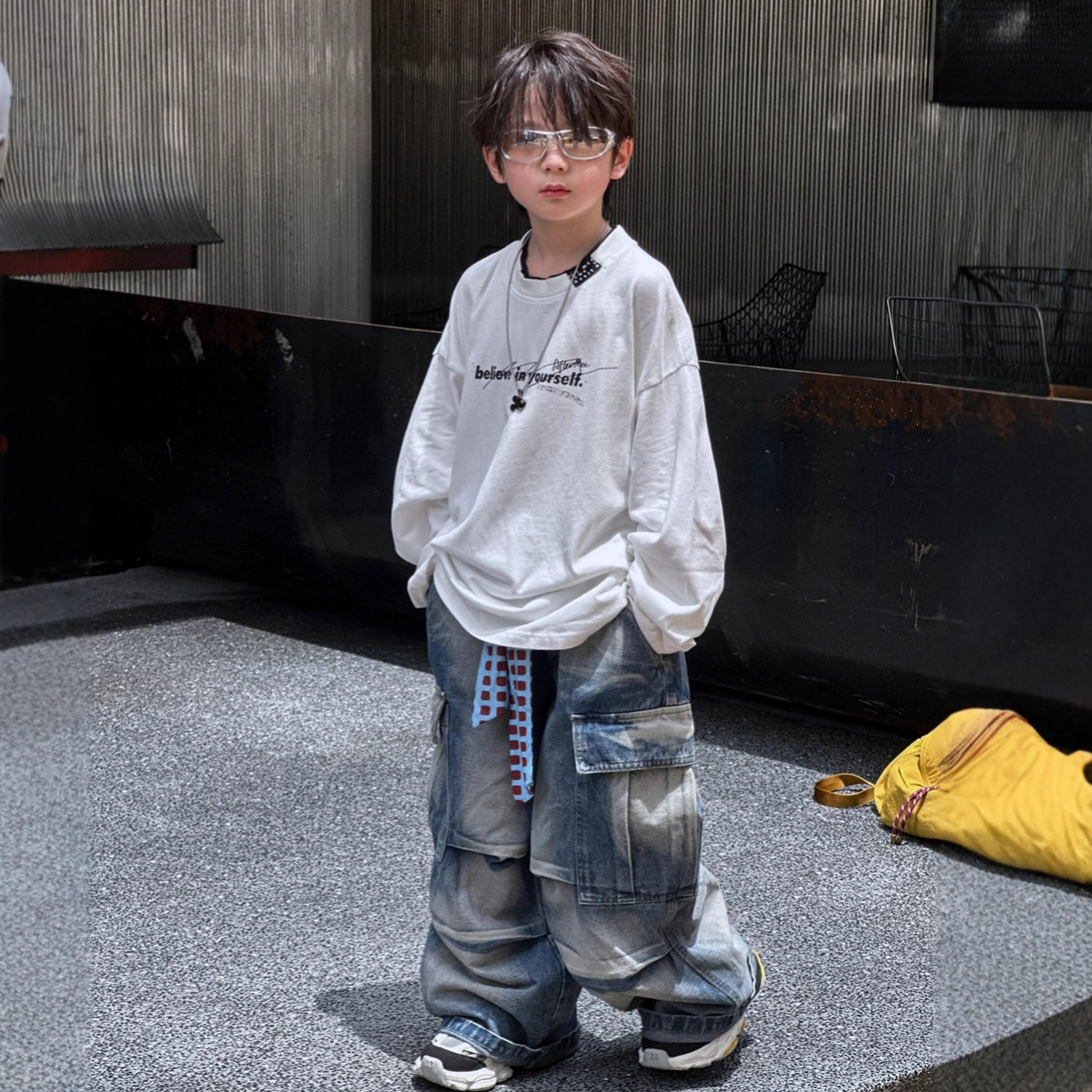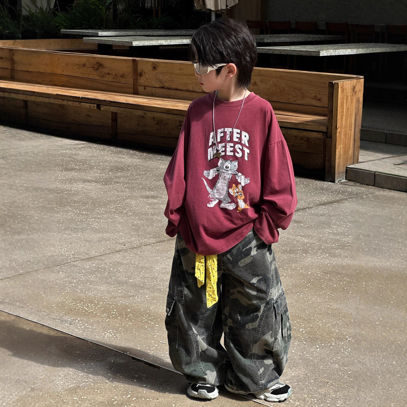 新尔2025秋季新款做旧炒洗卡通印花长袖T恤纯棉儿童宽松打底衫潮