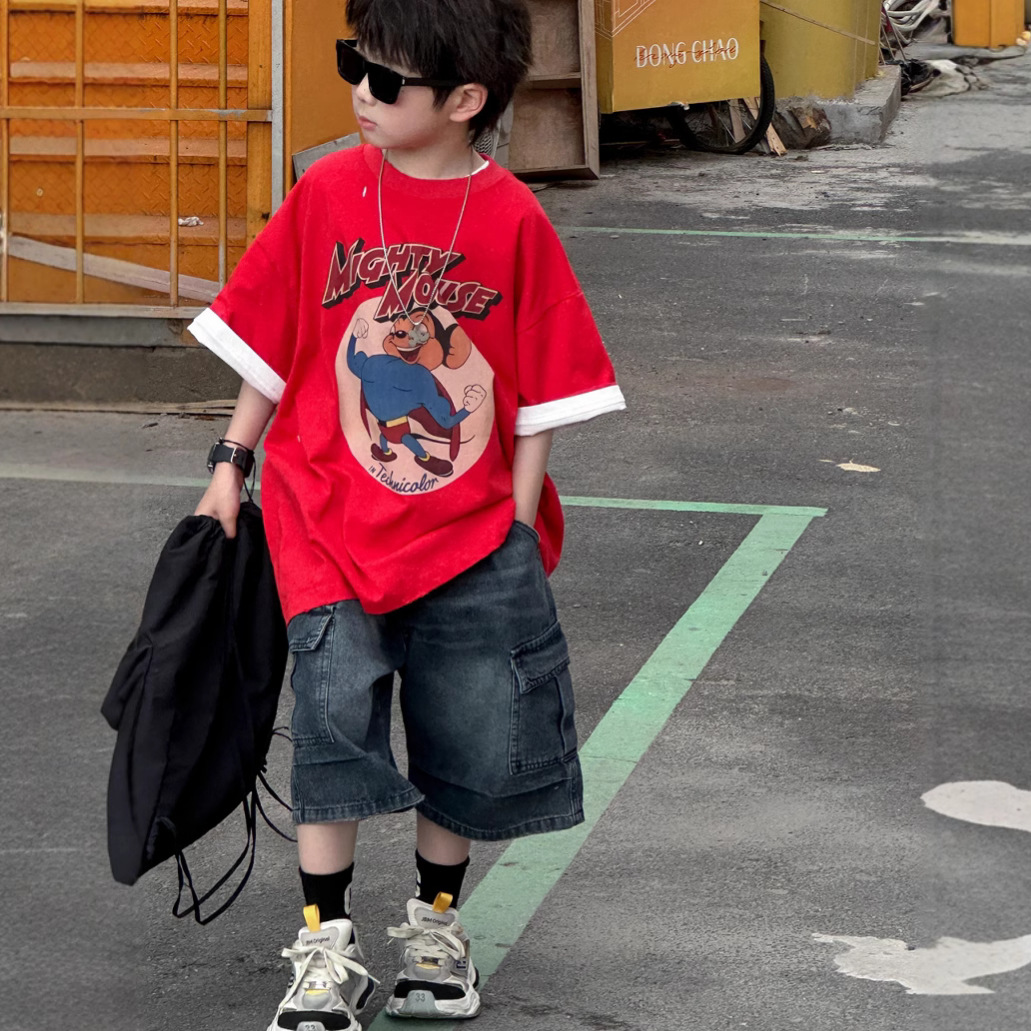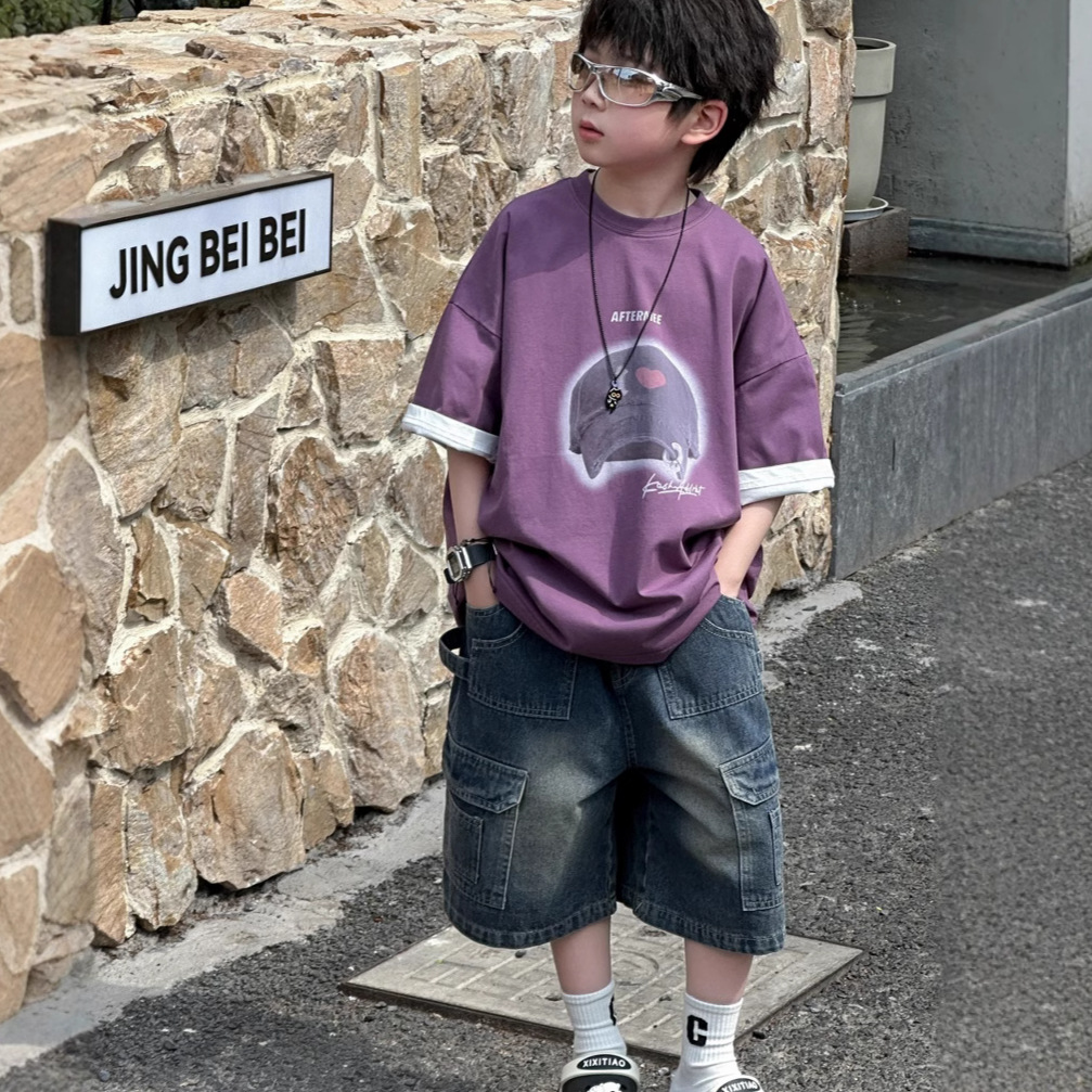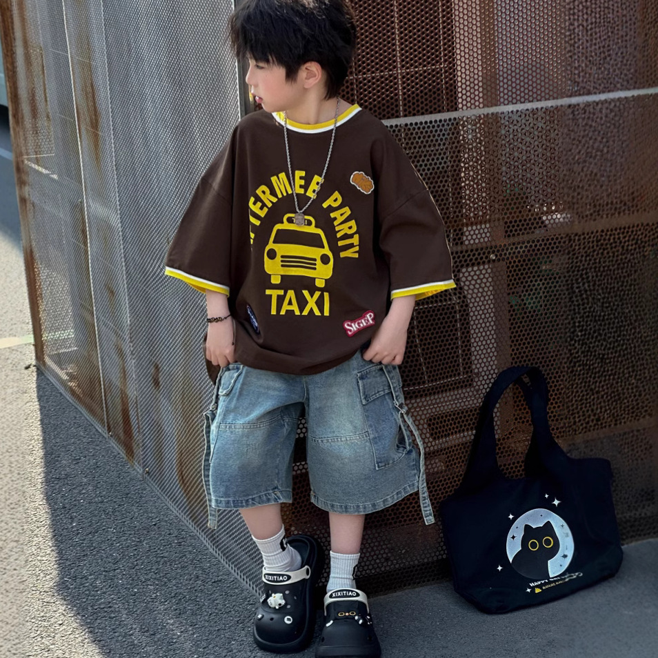 新爾2025夏新作子供夏純綿半袖tシャツデジタル直噴ハンチング帽子プリント男の子tシャツ