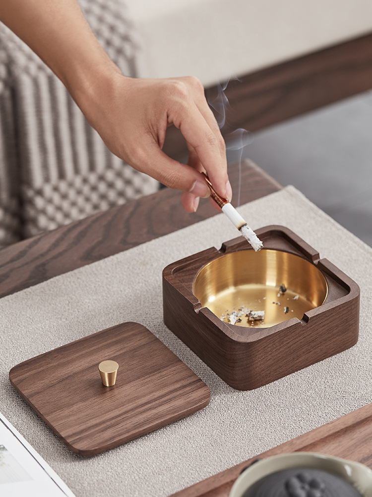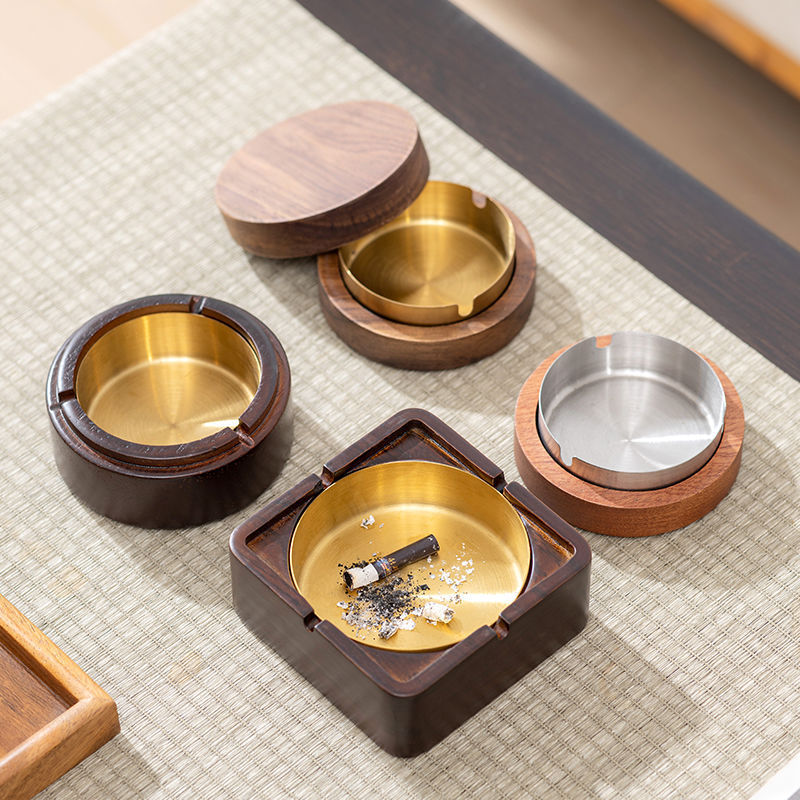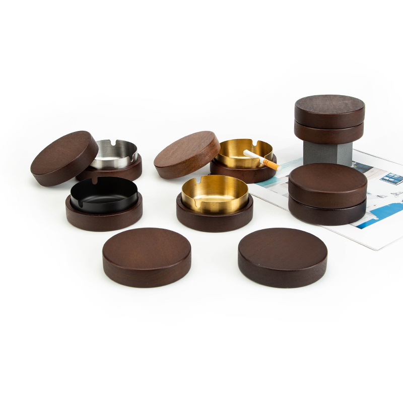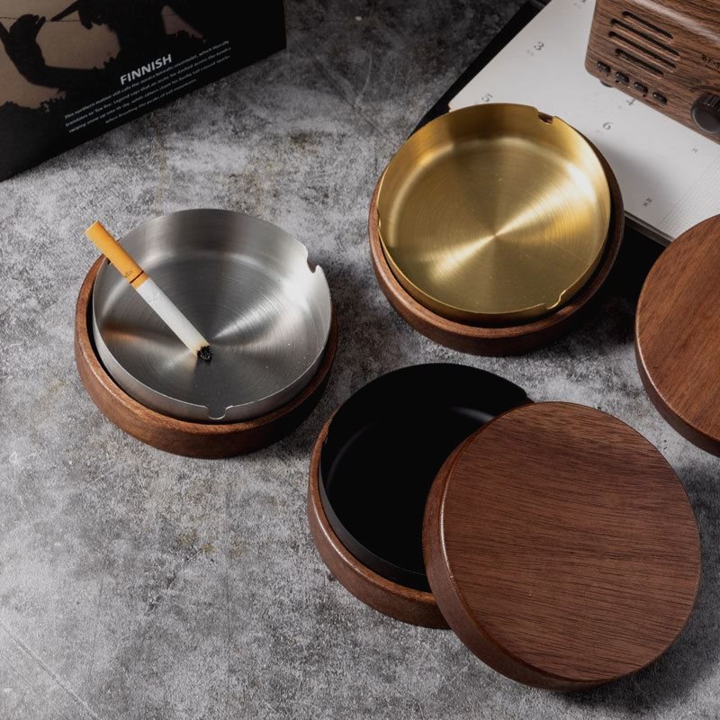 蓋付きクルミ材灰皿、飛散防止、ステンレス製、家庭用、アンティーク調、リビングルーム、寝室、コーヒーテーブル、北欧風、レトログレー