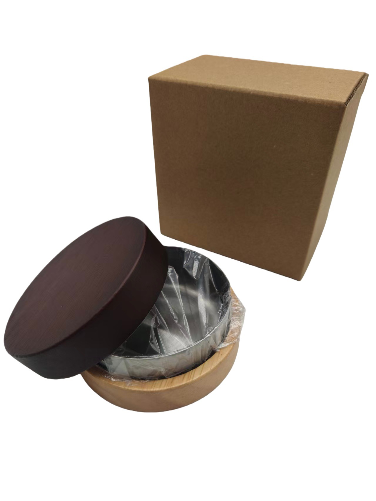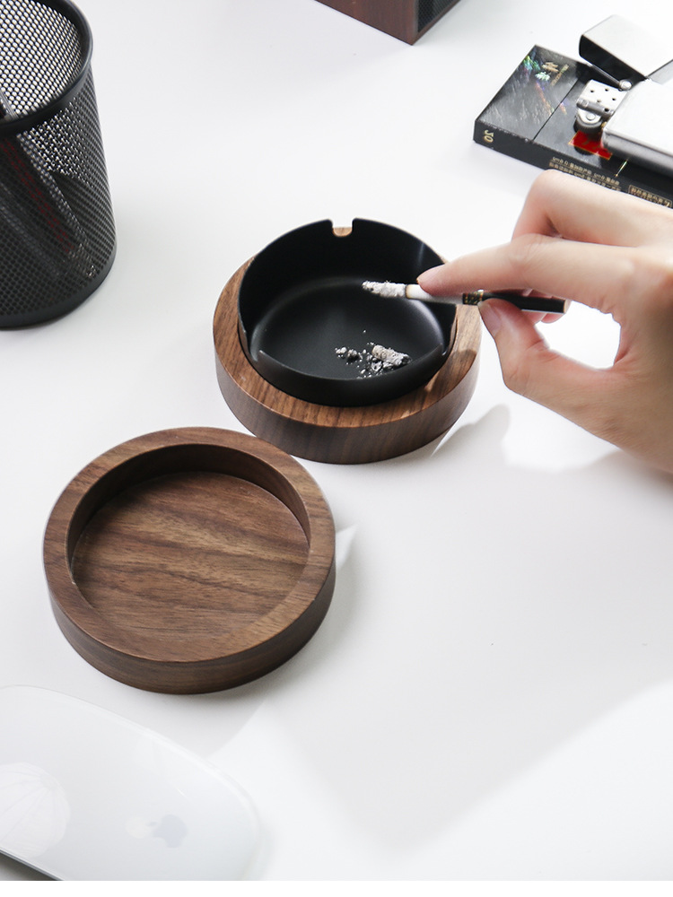 無垢材灰皿 アカシア材 ウォールナット色 木製灰皿 クリエイティブな蓋付き灰飛散防止 丸型灰皿