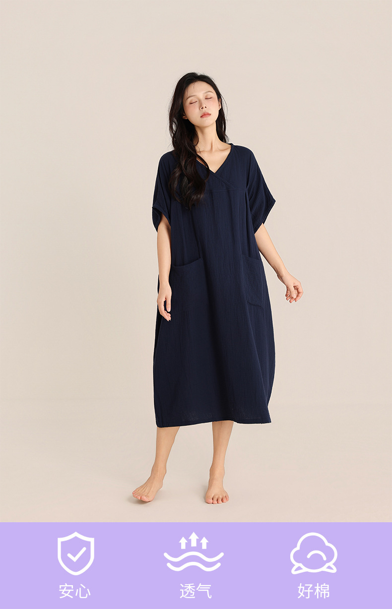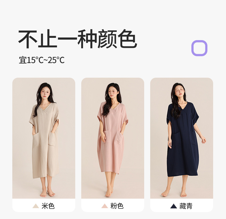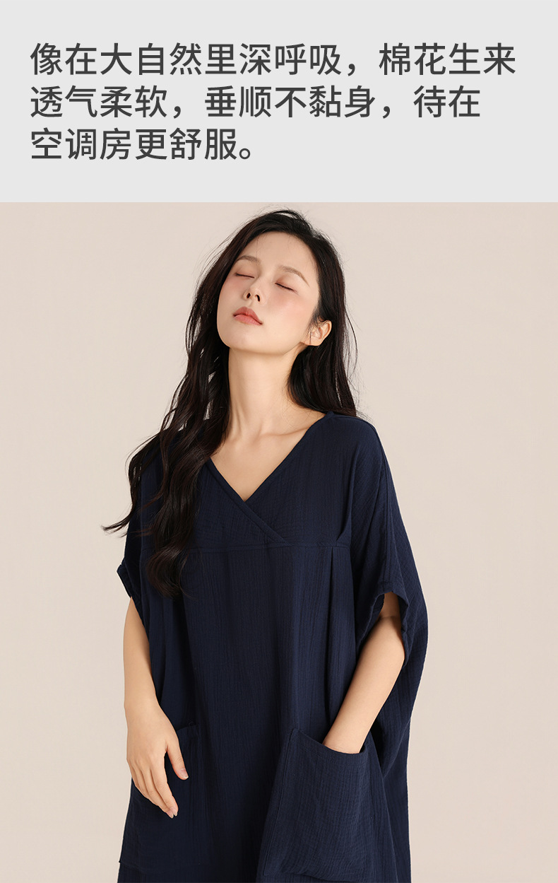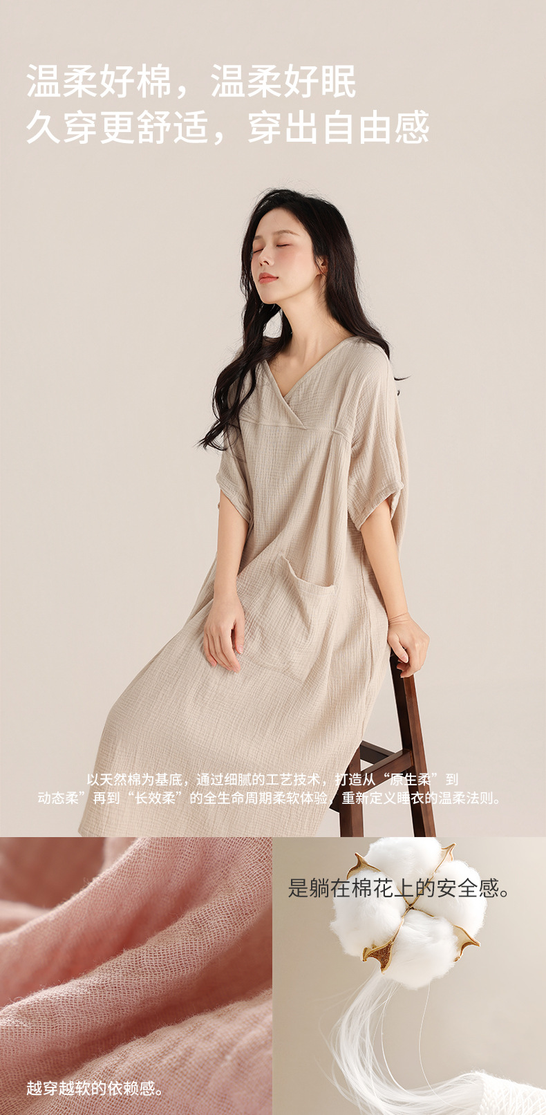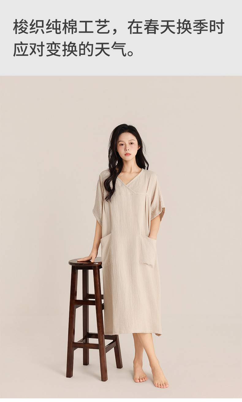 夏款无印睡裙双层绉布棉套头女士长款连衣裙简约法式家居服可外穿