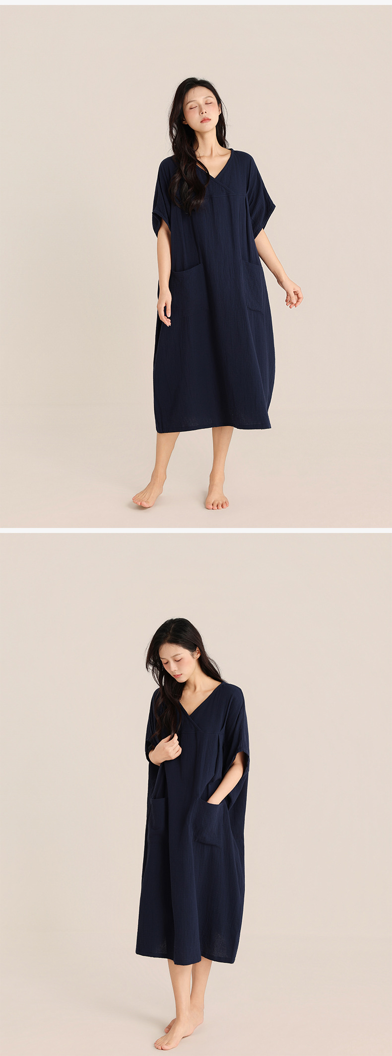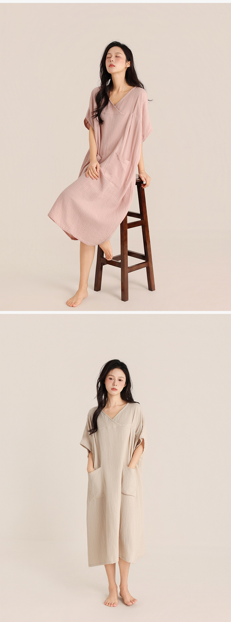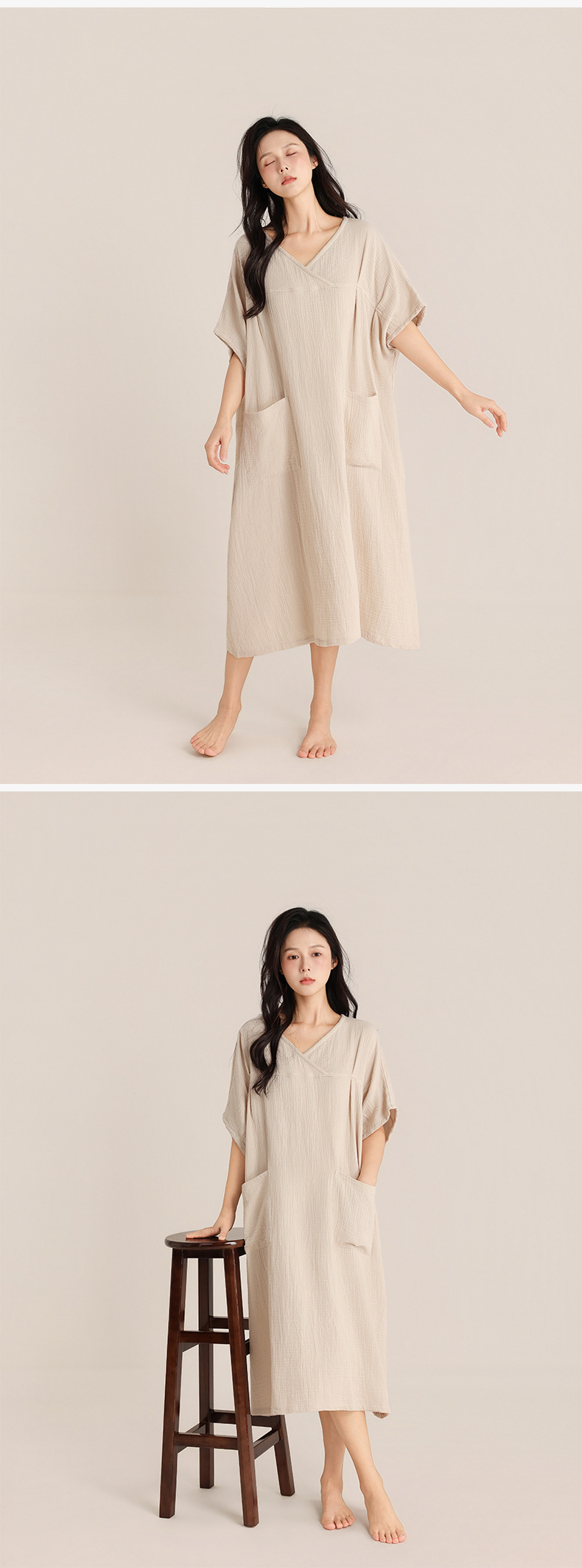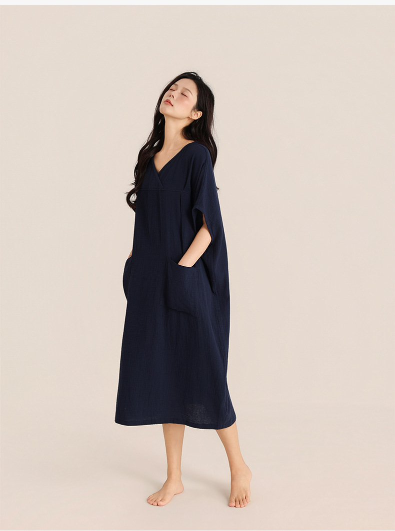 夏款无印睡裙双层绉布棉套头女士长款连衣裙简约法式家居服可外穿