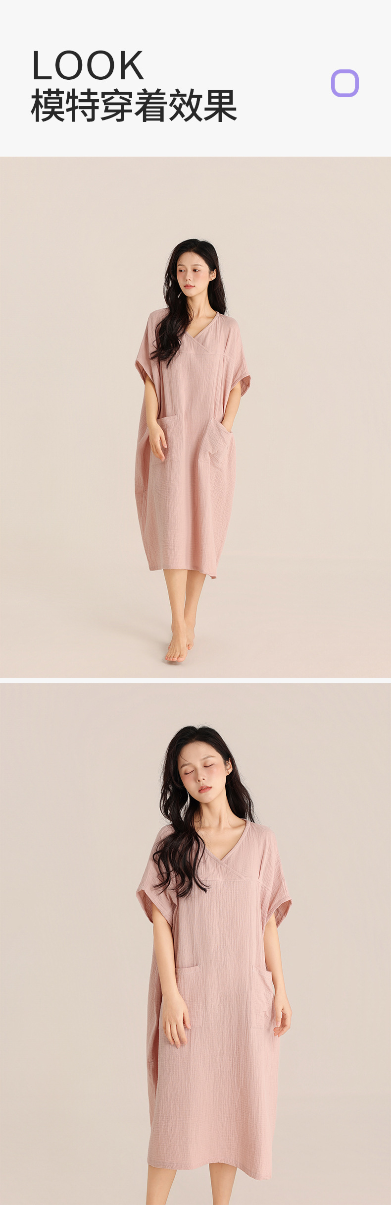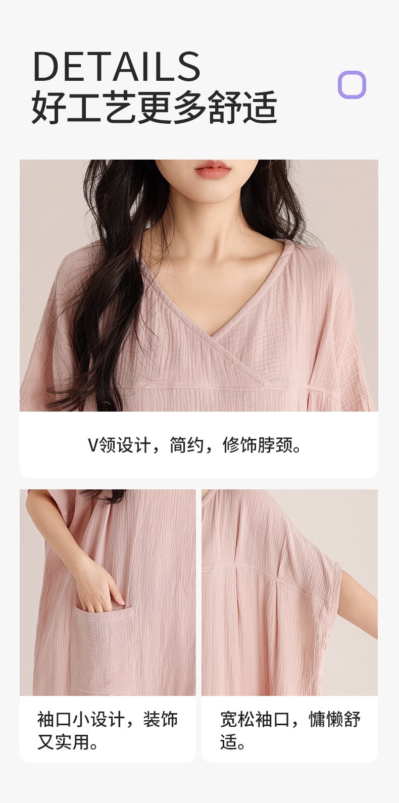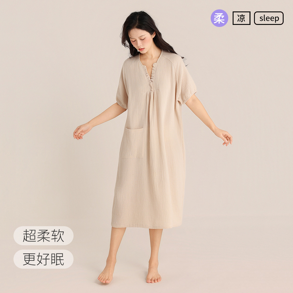 春夏季女士纯棉睡裙木耳边V领套头短袖长款睡袍 双层纱宽松家居服