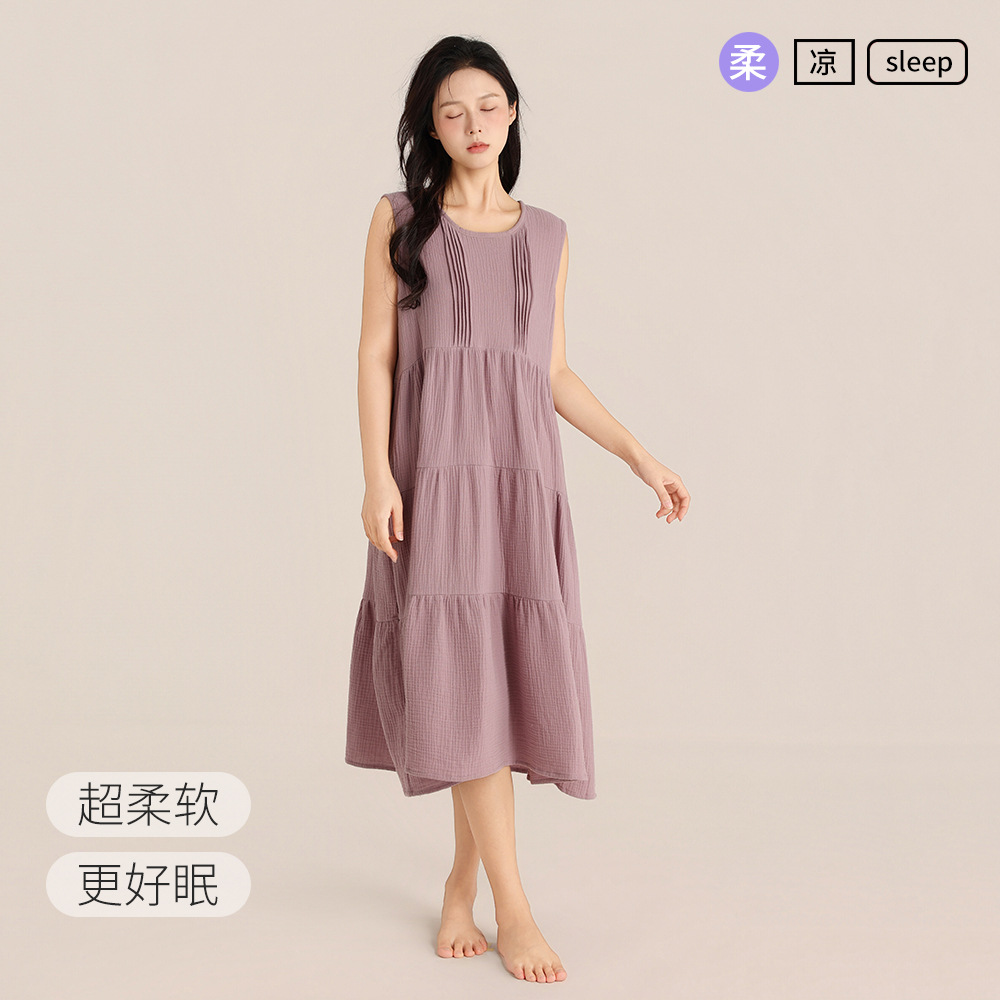 春夏季双层纱女士睡衣圆领无袖连衣裙学生宽松休闲长款睡袍家居服