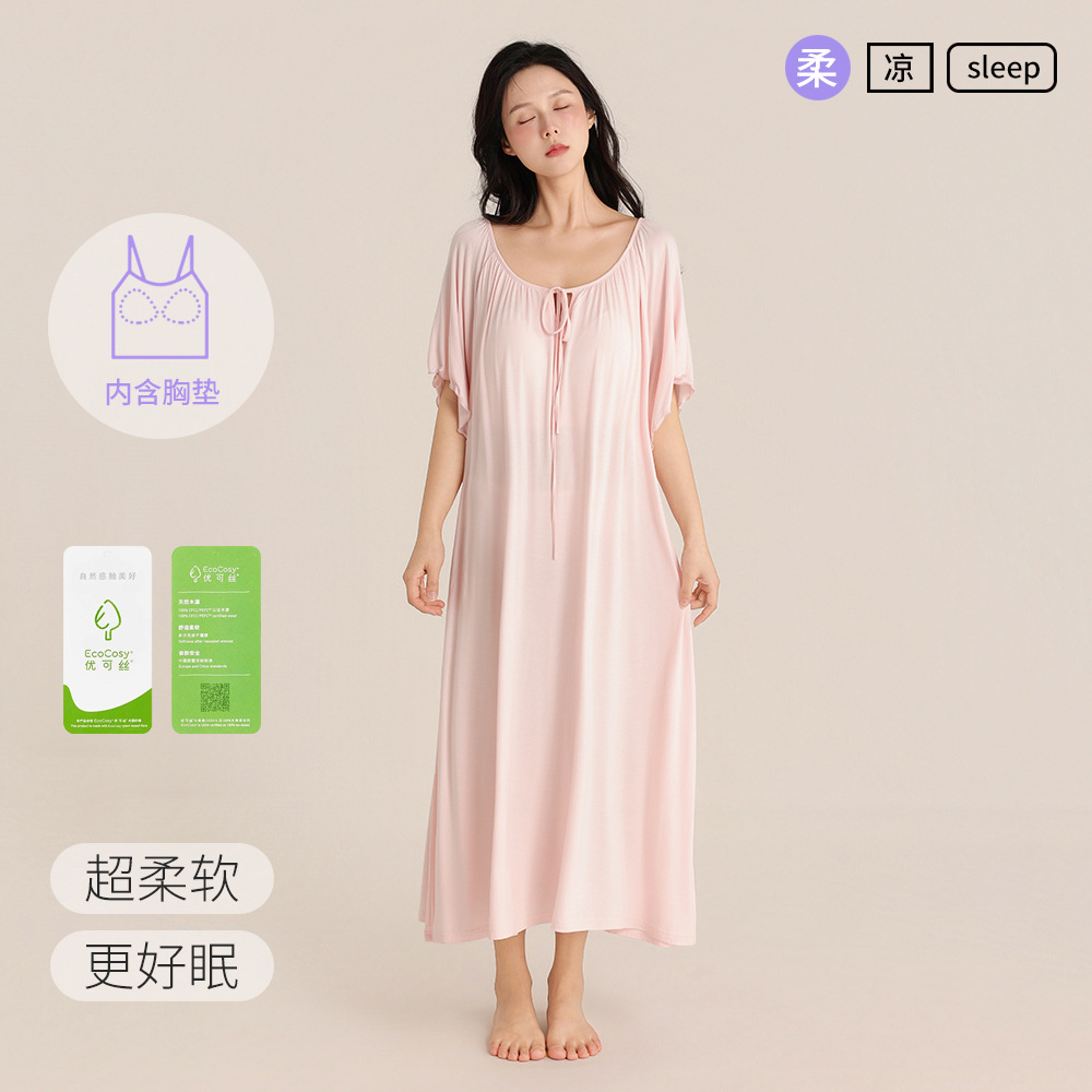春夏季优可丝女士睡裙圆领套头带胸垫纯色长款睡袍柔软凉爽家居服