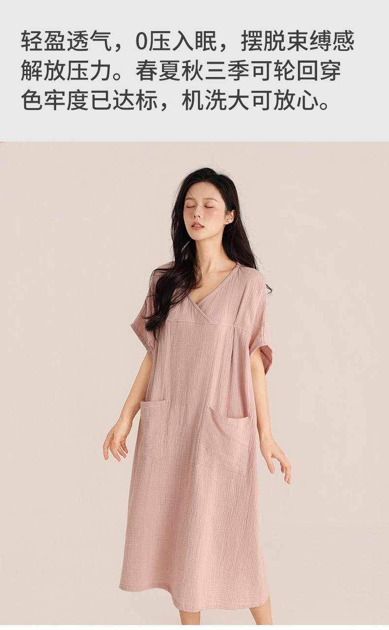 春夏款女士双层绉布简约睡裙圆领系带学生甜美长款睡袍宽松家居服