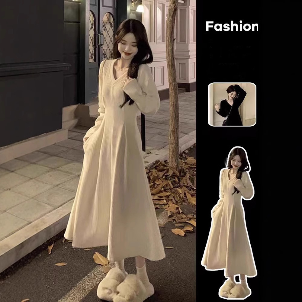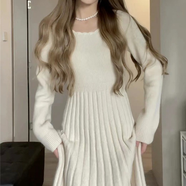 白色温柔茶歇法式后妈连衣裙子女大衣内搭针织毛衣打底长裙秋冬季