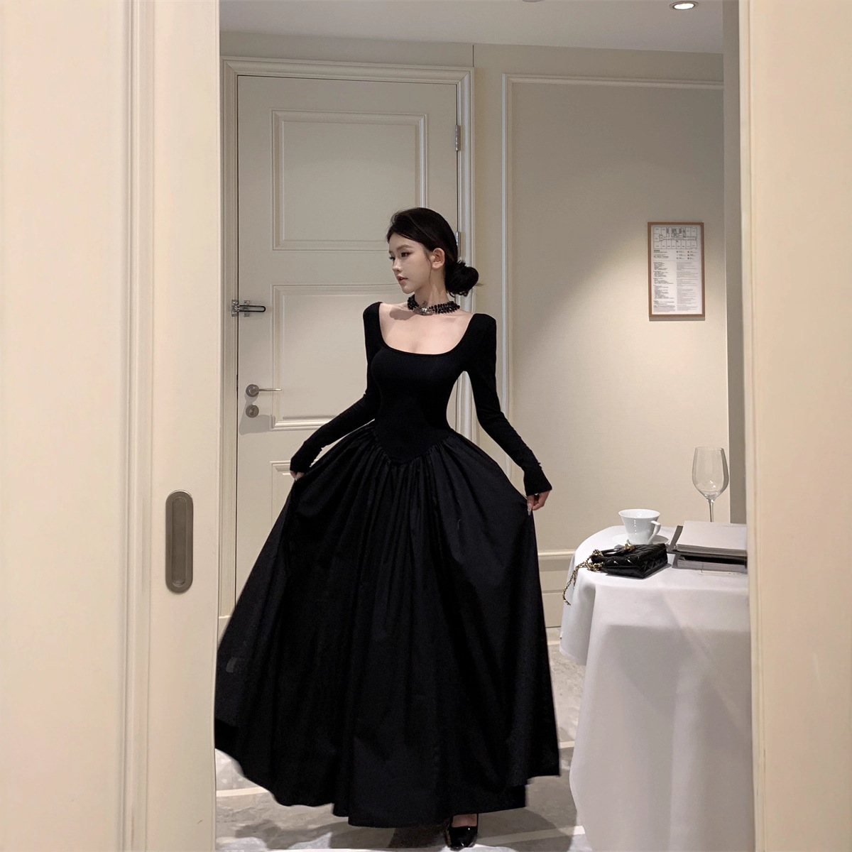 大码法式赫本风黑色方领长袖连衣裙女高级赫本风收腰显瘦蓬蓬长裙