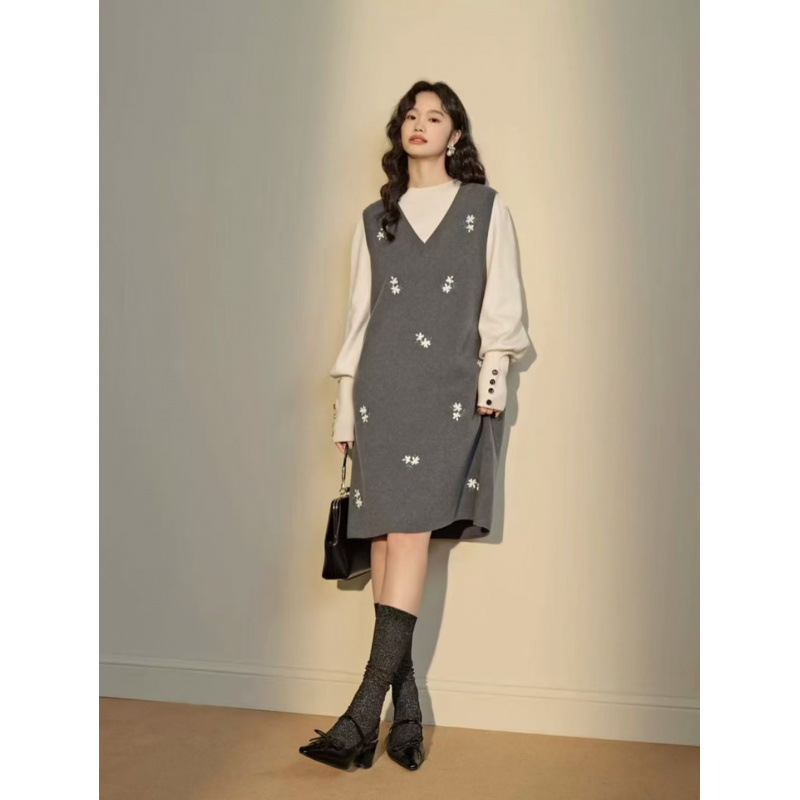 阔色灰色刺绣背心连衣裙女2025春季新款领外搭针织毛衣短裙秋冬