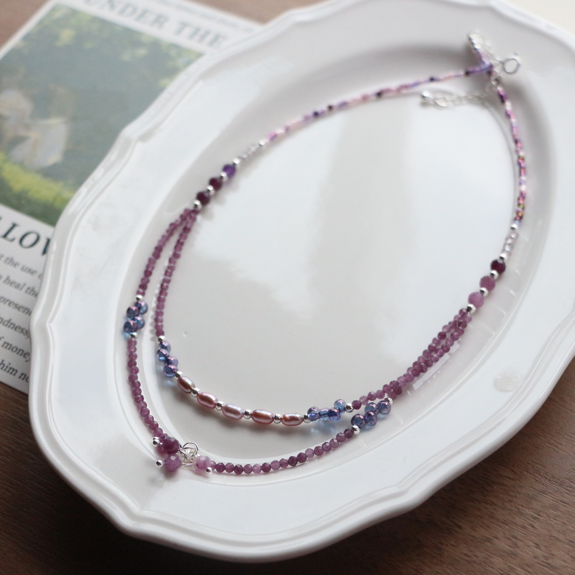 青晶石紫リチウム輝天然石創意ネックチェーン淡水真珠衝突色ビーズネックレス小サツマイモ同金