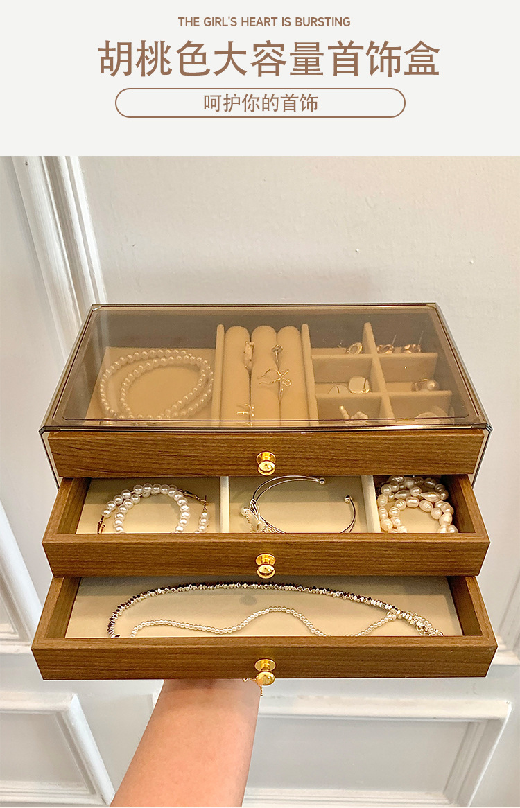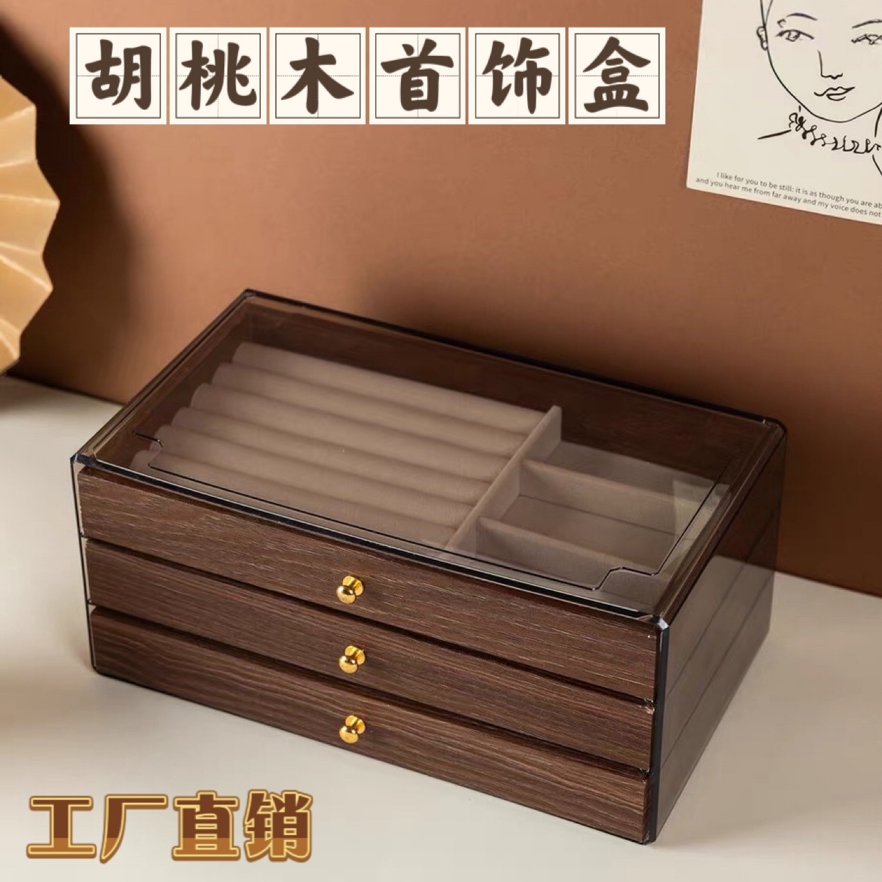 首饰盒胡桃木纹大容量防氧化耳环耳钉项链戒子收纳盒