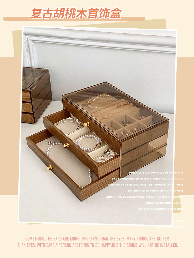 首饰收纳盒高级感精致耳钉耳环项链桌面复古胡桃木纹饰品收纳盒