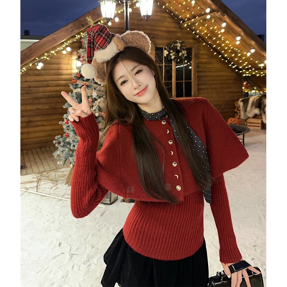 クリスマスの雰囲気感赤いマントのストールのセーターの女性の秋冬のニットの底のシャツの短い上着の2つのセットの服