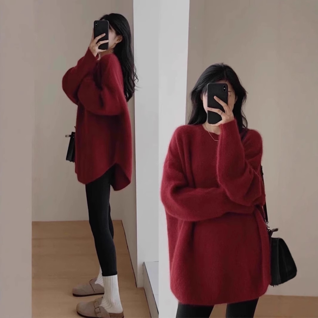干支年新年用の赤いセーター、女性用秋冬厚手インナー、小柄な方向けゆったりカシミヤニットセーター、ベースレイヤートップス