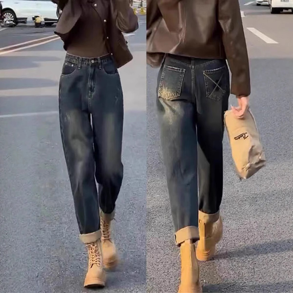 大きいサイズのハーレムとベルベットのジーパンの女性2024秋冬の太ったmmの高い腰はやせている弾力のまっすぐな筒の大根のお父さんのズボンを現します。