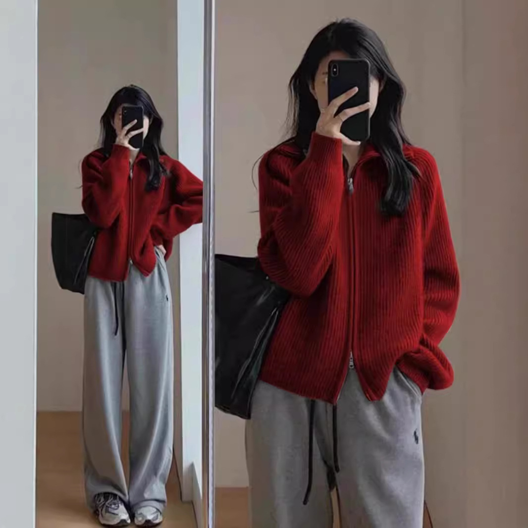 冬の新型の赤いタートルネックのセーターは優しくて、モチモチとしたダブルファスナーで底がゆったりしています。