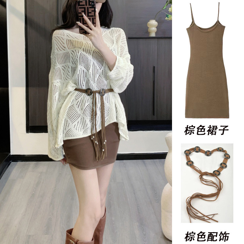 小柄な女性向けの2025年新作、軽やかな大人のフレンチスタイル、透かし編みニットのトップスとタイトスカートのツーピースセット